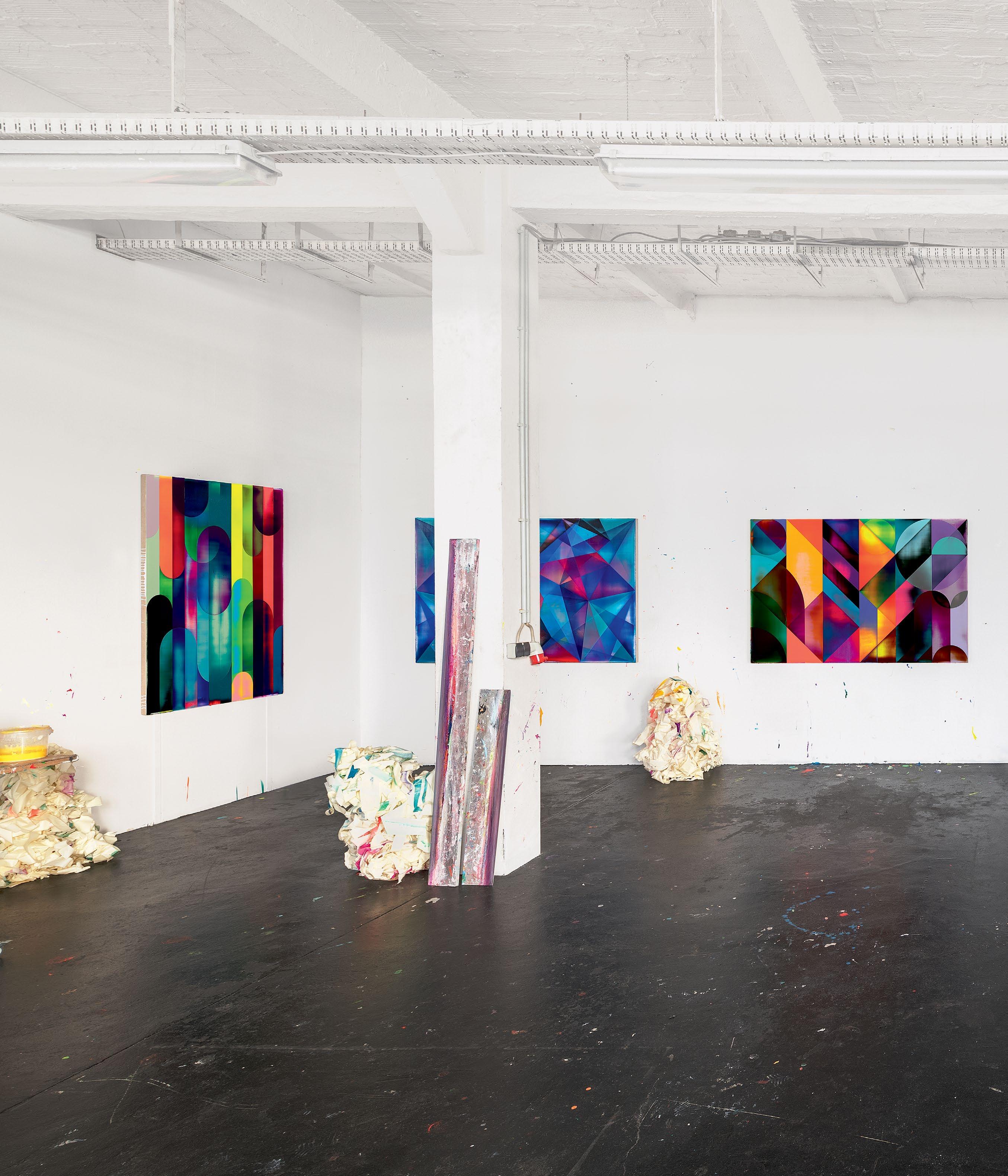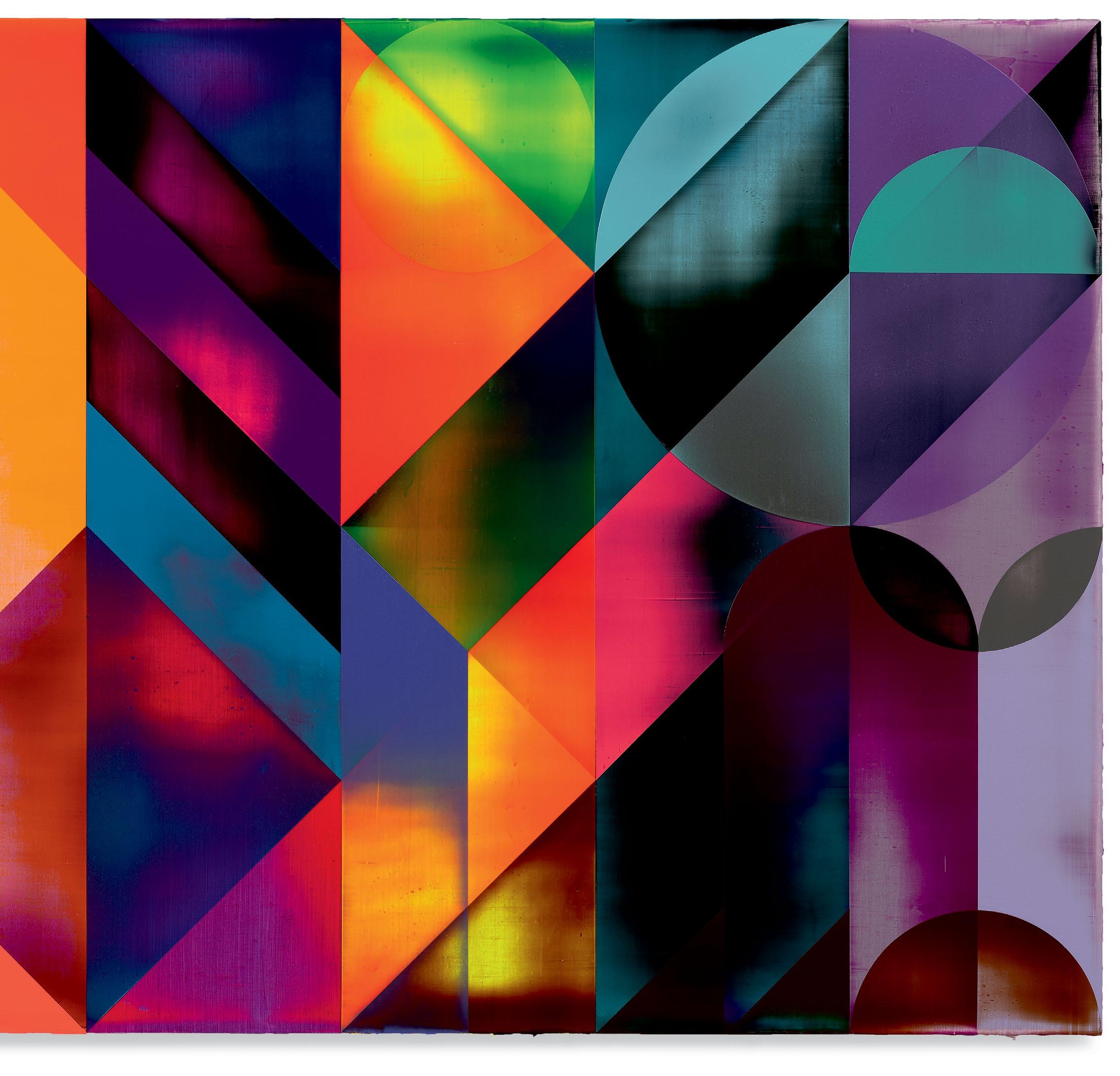 With this in mind, one might consider the ornamental quality of the various shapes that comprise Finley compositions. Each component—a triangle, a rhomboid— comes to function as a kind of key that cinches the integrity of the whole. Take the large-scale landscape format, Known Unknowns, for instance, in which Finley melds rounded and angular forms, and mixes deep blues and purples with tinges of neon pink, green, and yellow. As this wide variation coalesces into an image, each subtle flourish of color or bisection of line appears inextricable from the cohesive whole. Working sequentially in a series of layers, Finley tapes off parts of the canvas to segment his shapes in an array of colors. In a process he has honed over the past two decades, he moves from a digital mock-up of the composition, to the canvas,