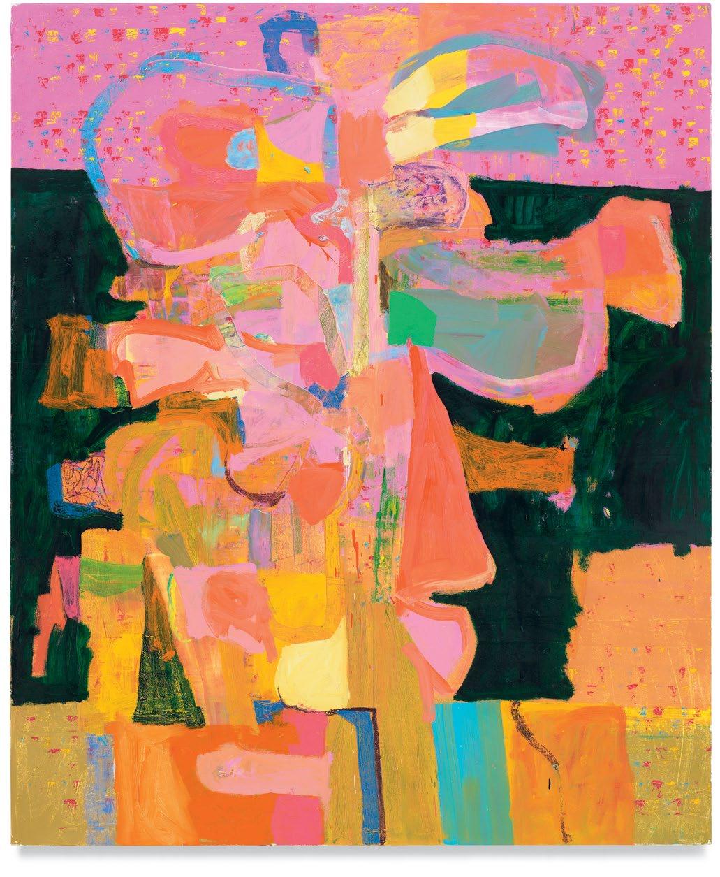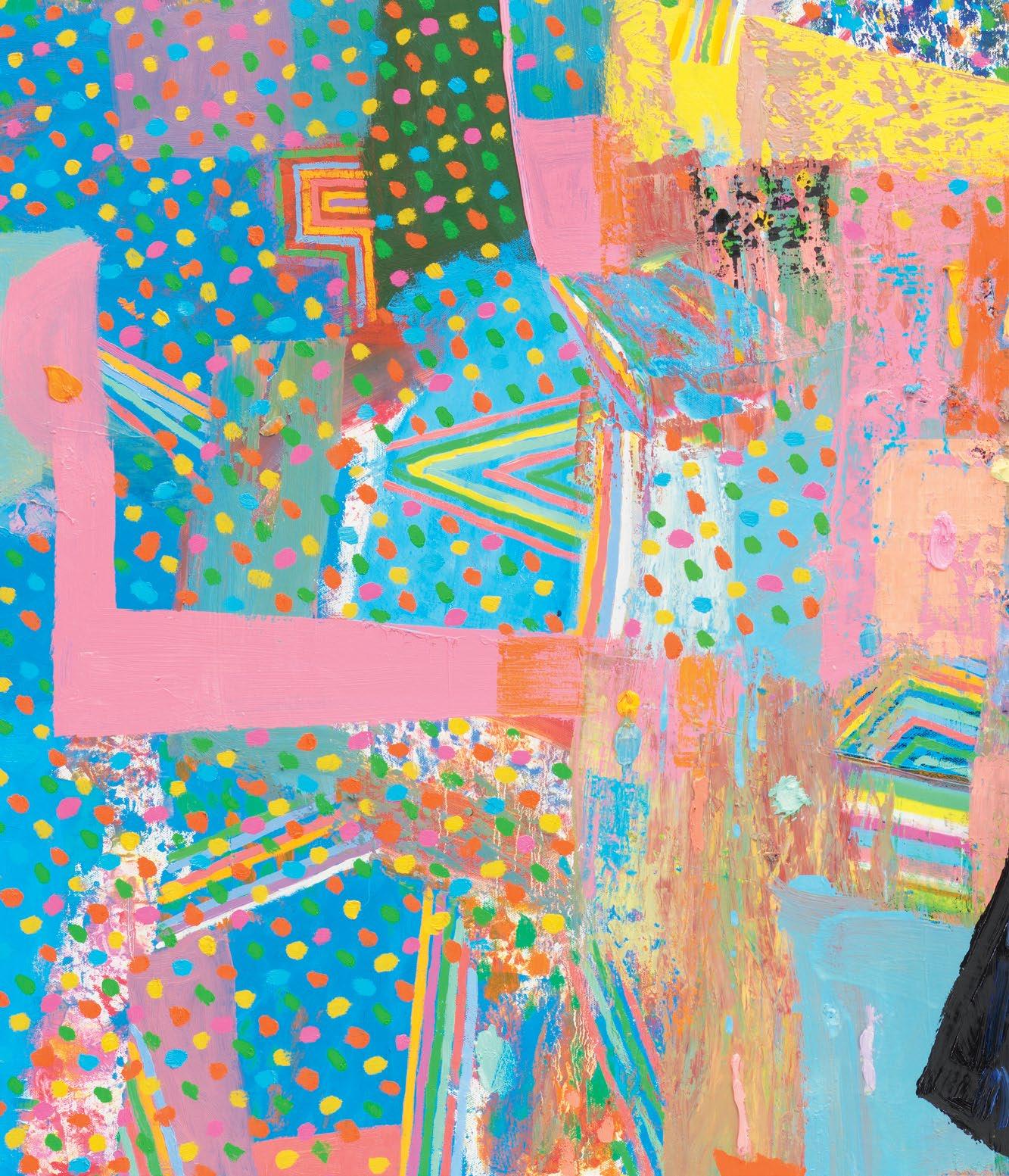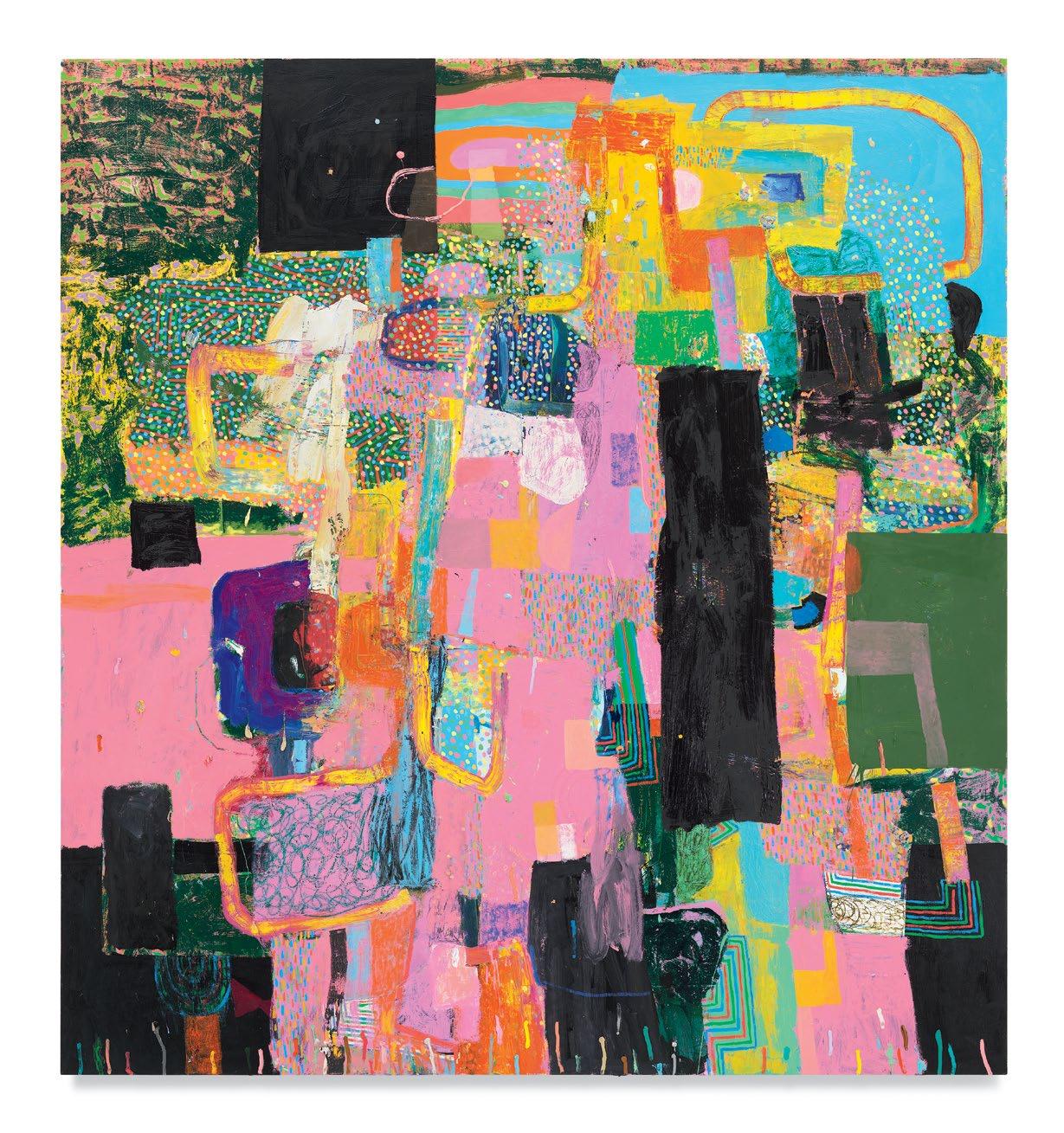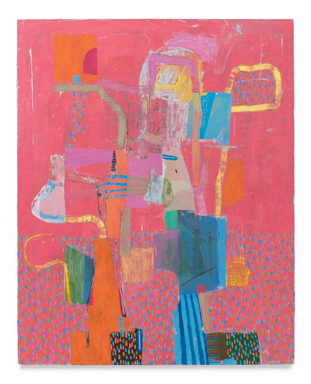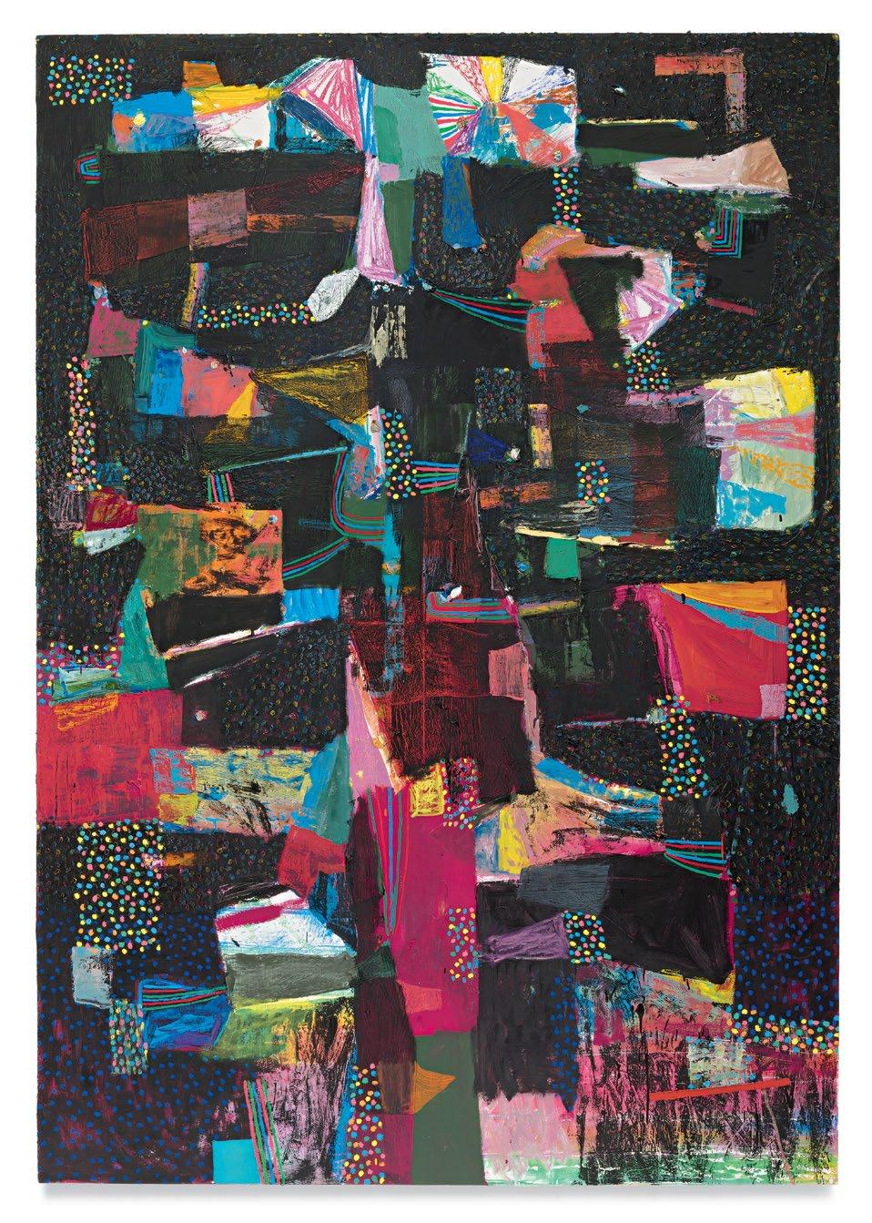 Standing in front of Dodge’s paintings, unfinished yet well on their way, it was clear to me that he had moved his work squarely into the painting multiverse that I’ve suggested above. A er a couple of decades’ worth of solid paintings that arranged and rearranged the terms of their “equations,” these newest paintings strongly suggest a sophisticated coming to terms with their potential for multiplicity and freedom, while remaining commi ed to some of the most tried-and-true, even intrinsic, components of painting, which remains a unique enterprise.