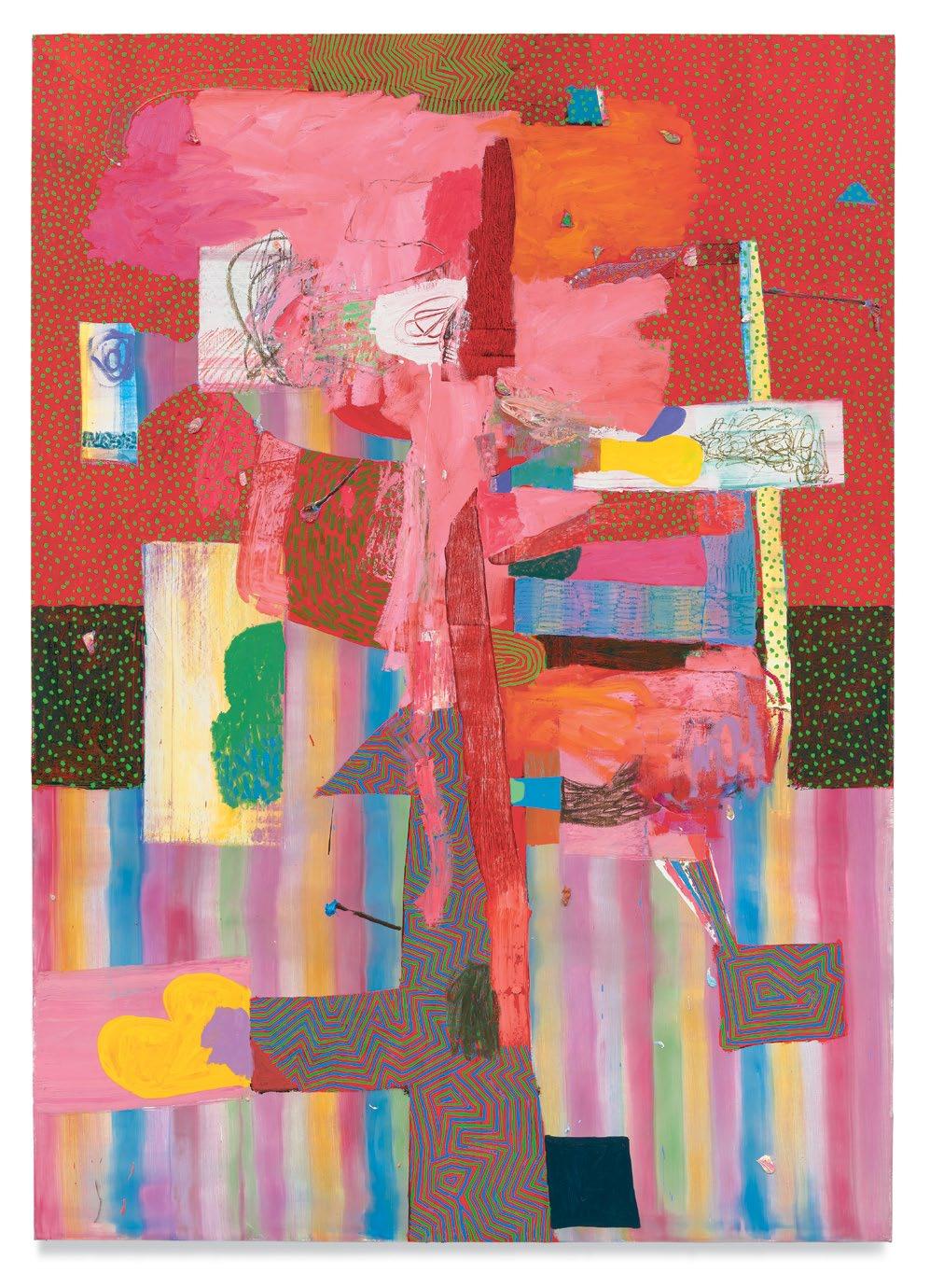 Take, for example, a painting called Wild Fox Body. As with all of Dodge’s paintings, there is a tremendous amount of stuff that comes together as a kind of roughly rectangular body existing in and on a rectangular surface. This could be understood as the overarching requirement for these recent paintings, a tautological anchoring of the work that literally grounds the remainder of the work’s numerous visual and physical a ributes and their possible functions within the overall space of the painting as a painting and as a picture. This is key, as is the close a ention that is being paid to surface here.