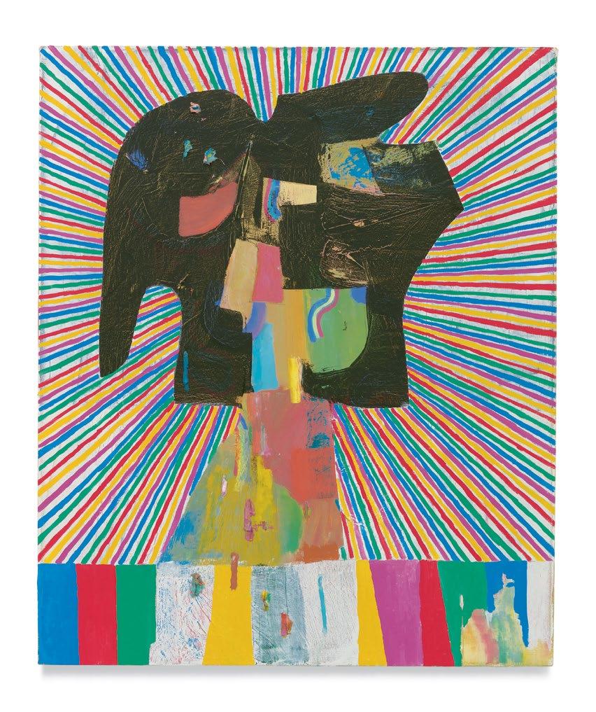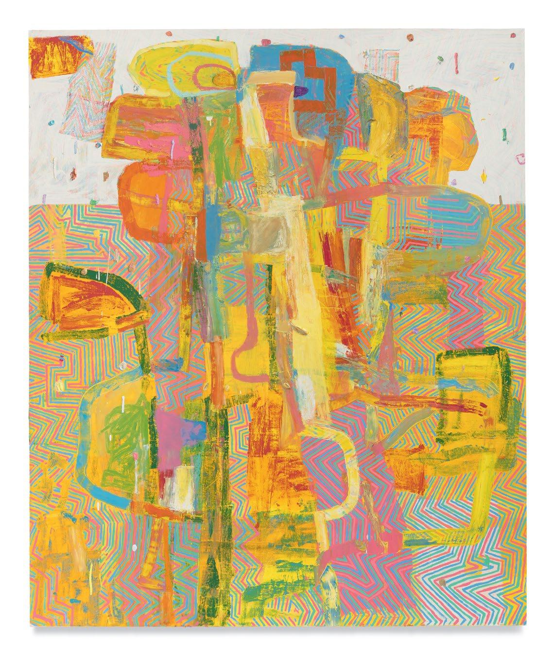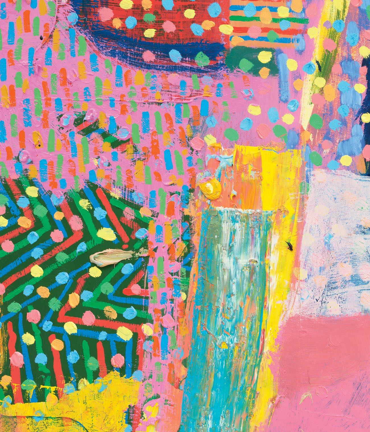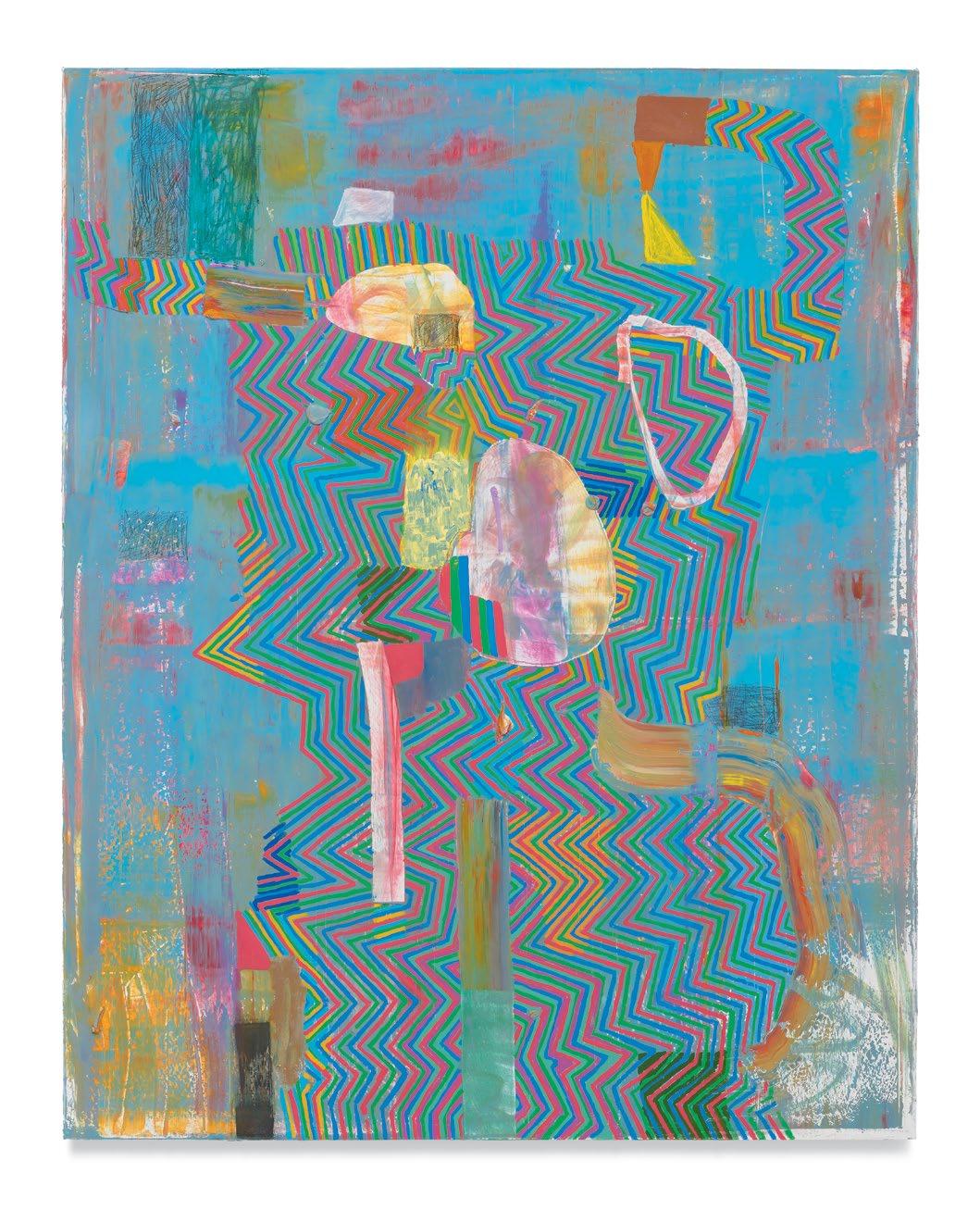 While it is self-evident that Dodge produces a wide range of surface effects with the paint he uses (all the while reinforcing that the paint itself can also be given many different surfaces as paint), the painting “insists” on its own overall surface. So, then, in the case of another painting like Horns, the body in and on the body of the painting may be more diffuse that the one in Wild Fox Body, almost slipping in and out of focus despite the all-over distribution of Dodge’s signature multi-colored zig-zag pa ern, which makes me think of the likes of Picasso’s figures of musicians, even though they’re not really the same at all. (I can’t help but see the figure in Dodge’s