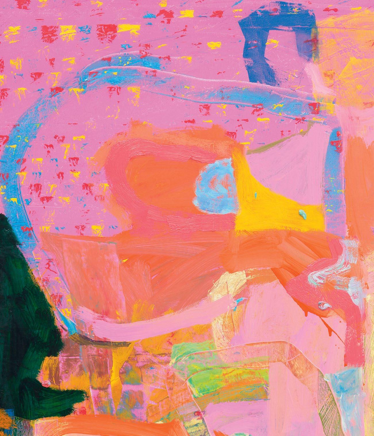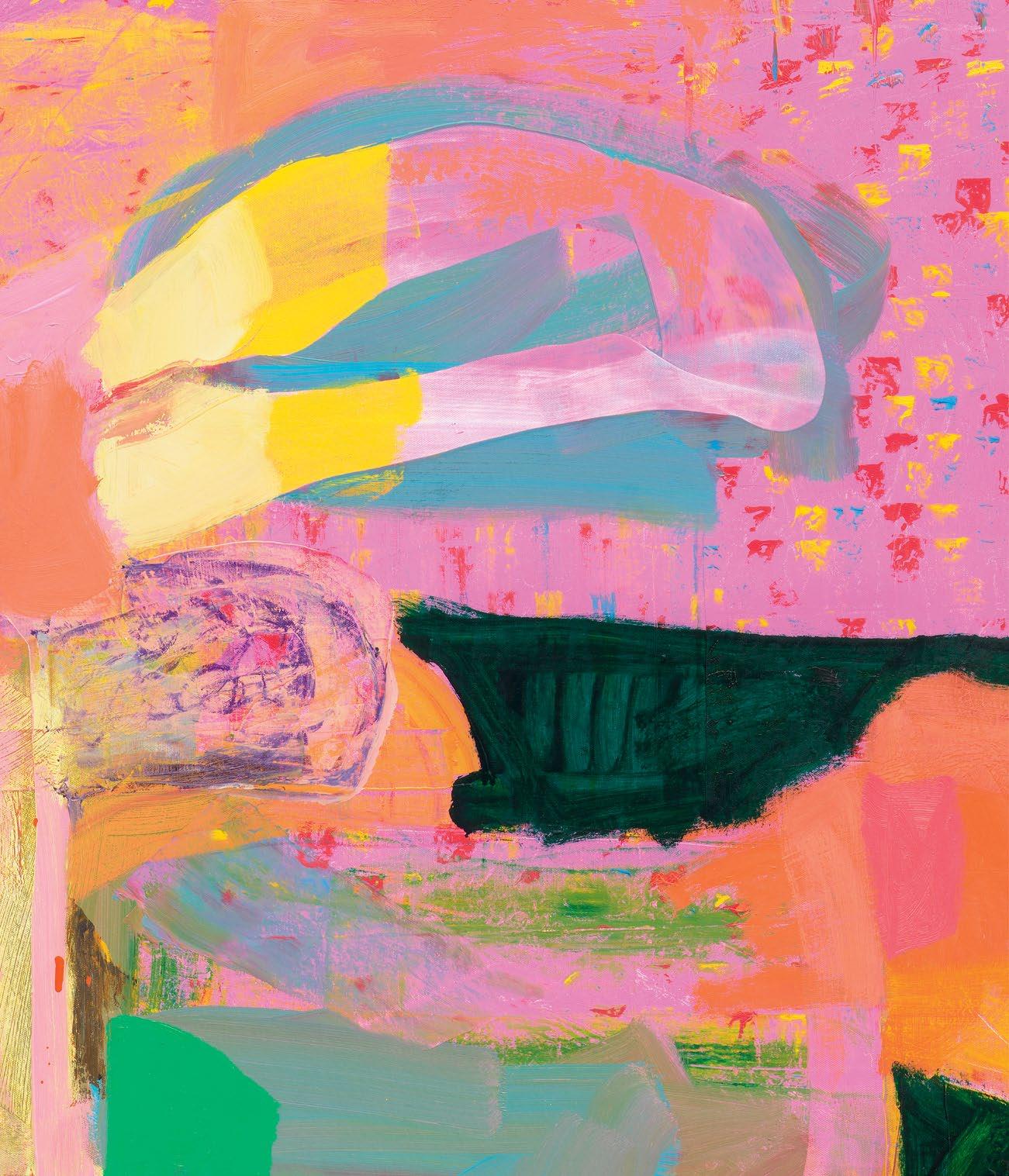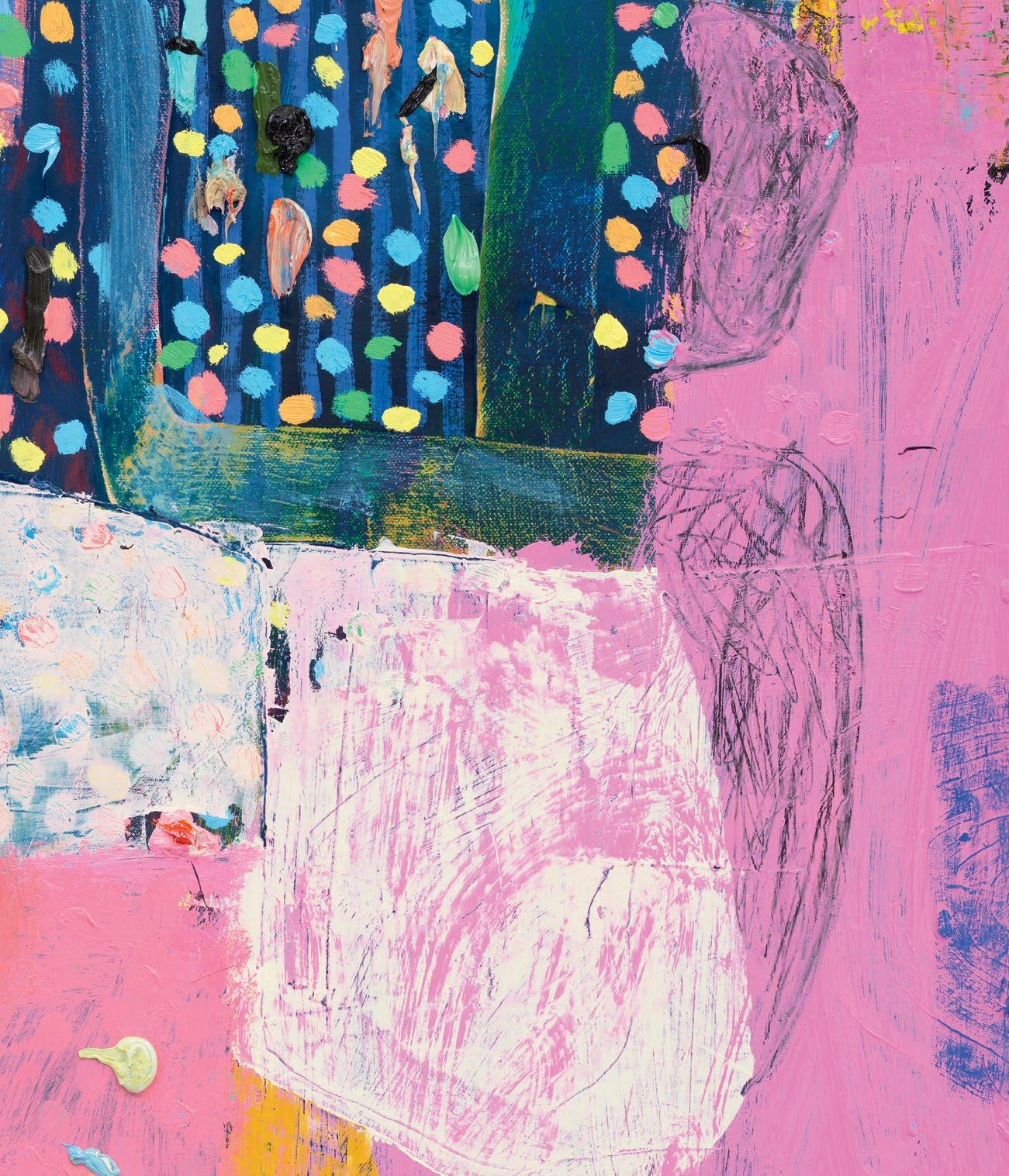 Dodge’s titles also do their part for his multiverse. For example, he chose Wild Fox Body mainly because it refers to a Zen koan that suggests that people see their true nature when they recognize the oneness of cause and effect. I don’t think it is an overstatement to say that the oneness of the bodies in and of Dodge’s paintings contain multitudes. In the case of one last painting called The Krell, the reference is to an extinct advanced race from the planet Altair IV in the 1956 film Forbidden Planet. Living subterraneanly (in the “body” of their planet?), they were believed by the human researcher who arrived a er their disappearance to be able (among other things) to reproduce anything down to the molecular level if they were in possession of a prior sample. They also were the creators of a “plastic educator” device that could create a three-dimensional visualization of the operator’s thoughts. (Alas, that one ended up being deadly for humans.) There was, tellingly enough, no evidence of what the Krell looked like. This is where I think again about that mask I wore in the studio and how we all have had to adjust our own “claims” to expression. I can’t help but think that all of this has everything to do with the achievements of Dodge’s recent paintings, even if we’re not really able to comprehend the multiverse just yet.