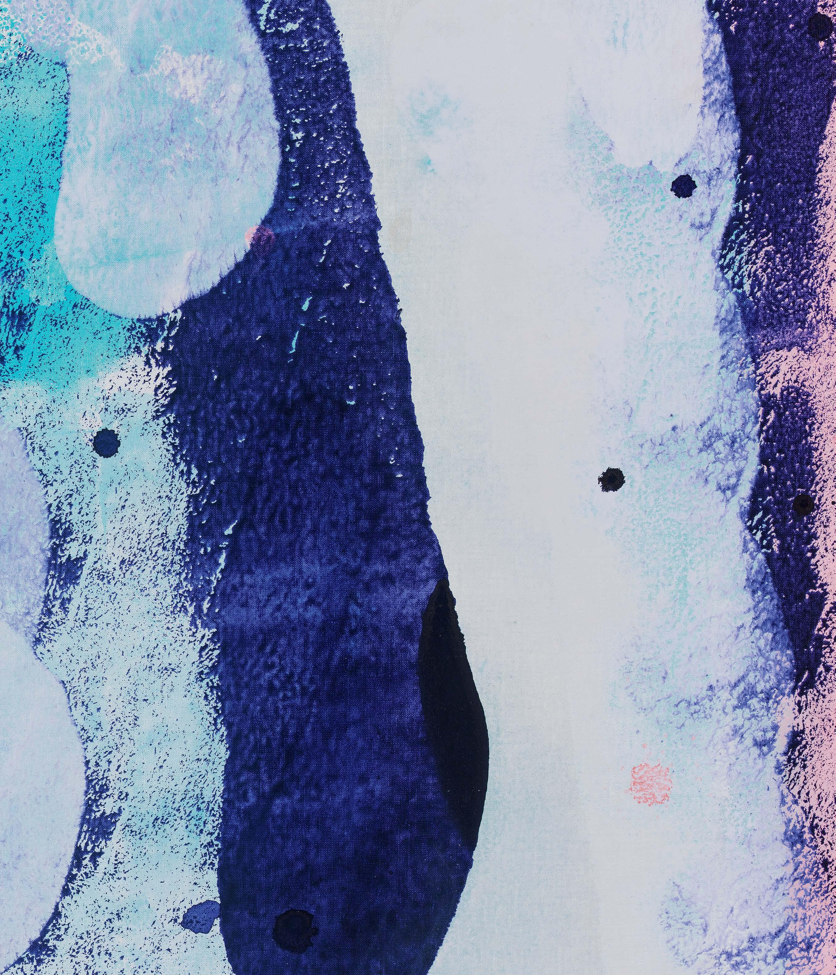For Uexküll and Grosz, as with Latour and Haraway, there is a dialogue that is unfolding and in time, in which “each living creature is a series of ‘tonal’ responses to various ‘melodies’ played by its umwelt, through various performances it undertakes....These tones make particular objects in its wild drinkable, editable, walkable, sittable and so on....”18 In Min’s New Paintings, recording this animating principle produces a liberating effect, inspiring not only a vocabulary of relationality but of mystery and the unexpected, where all living things are “tuned” to their environments. It is this humming attunement that governs the paintings on display, each of which can be understood as containing this insistent liquid desire.