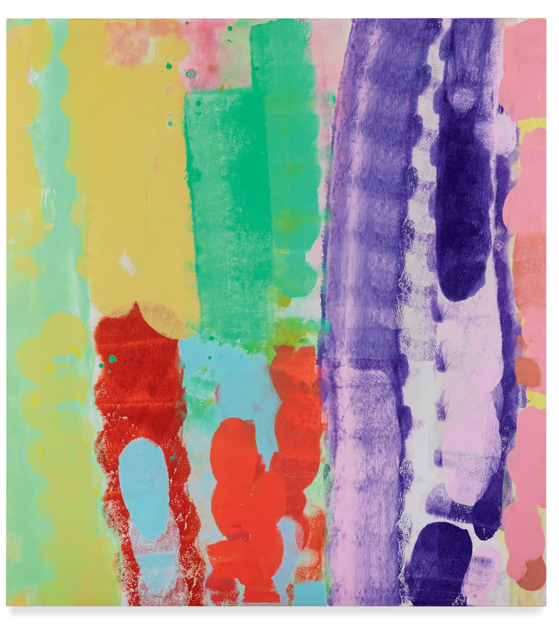 The act of recording the body in this way, of using paint to lay down haptic tracks and mix time as embodied by coagulated pigment, can be understood as philosophical in scope, mapping how objects and actions relate to one another. But it is also related to sound, an abiding inspiration for the artist. Sound in this way can be understood as a register of energy, a manifestly fluid state that constitutes what the philosopher Gilles Deleuze calls the “machine of desire” that, when aroused, results in what he designates as “territory” or site being established—as in a painting.3 It is this protean conversation, about the tension between territory (depicted as line, border, edge, mark, field) and wetness, as both solvent and catalyst, that Min takes up.