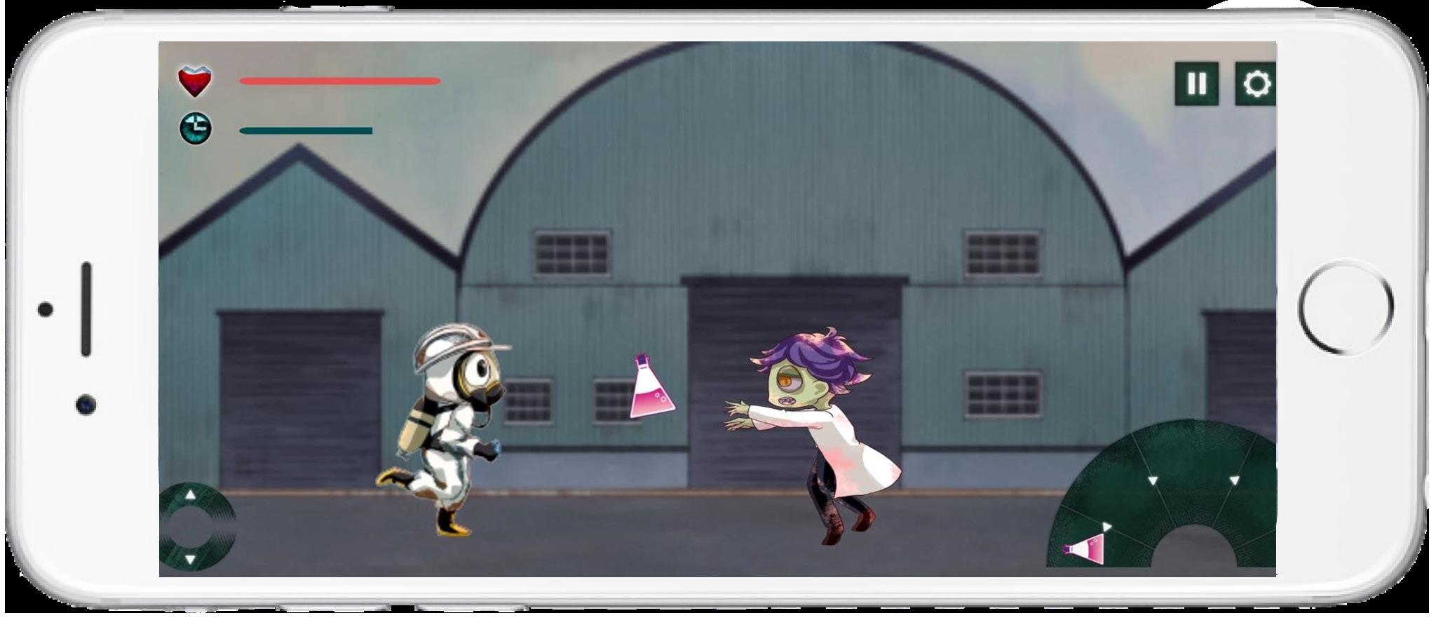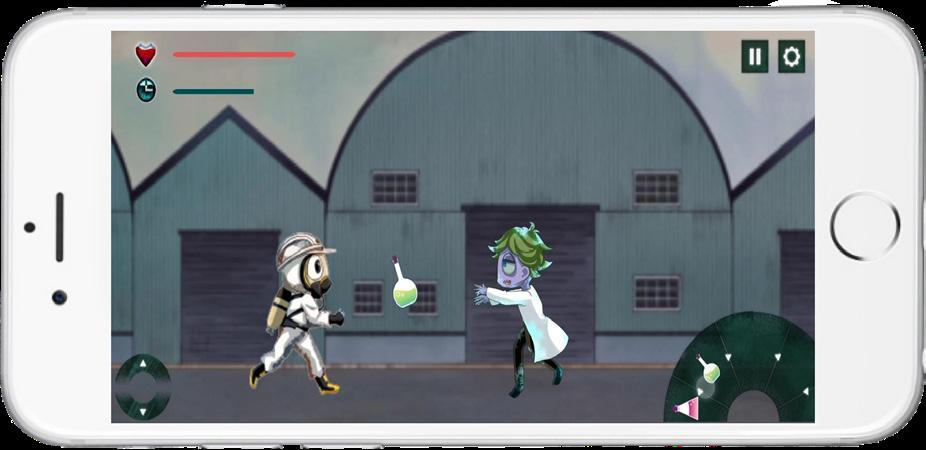 The game is divided into four levels, with difficulty varying based on the number and types of patients. The interface is intuitive: the left thumb controls movement, while the right thumb selects the decontaminant. The top-left corner displays the current health and remaining time for the level.