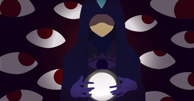 The design uses a crystal ball, symbolic of Western sorcerers, as the background, while integrating Eastern Taoist talismans and elemental motifs as inspiration for the icons. This fusion of styles is reflected in the visual and text-based menu layout.