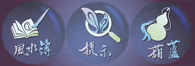 The text menu includes items such as the Feng Shui Book, Hints, and the Gourd, each allowing players to view its specific content. For example, players can view scroll records for each level within the Feng Shui Book (left image, second item from the left).
