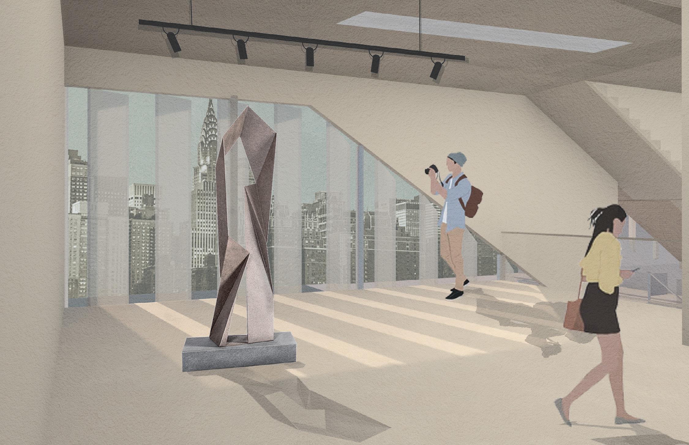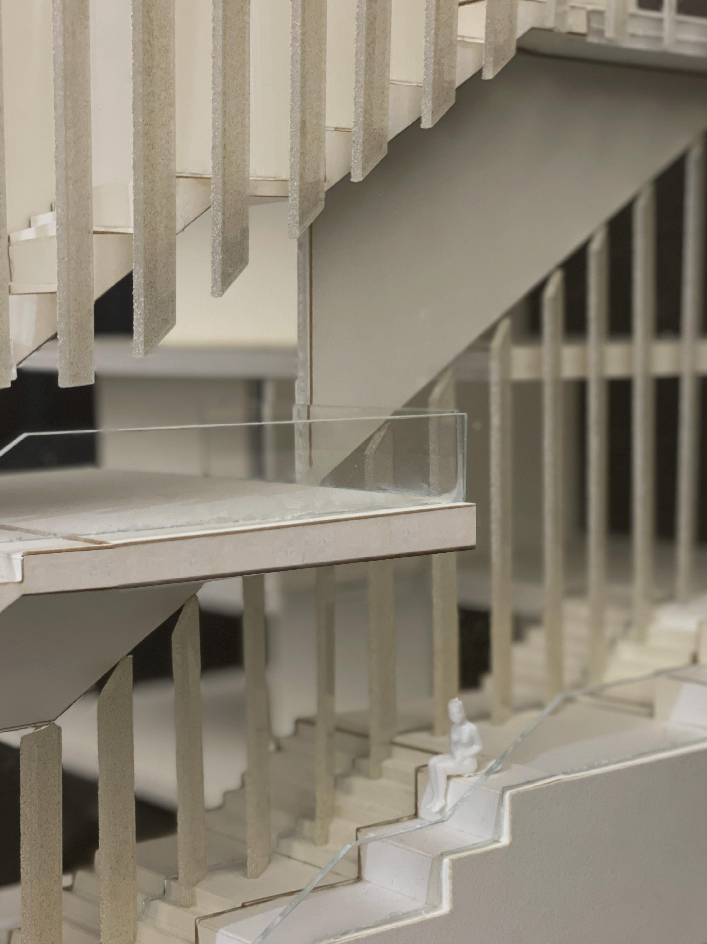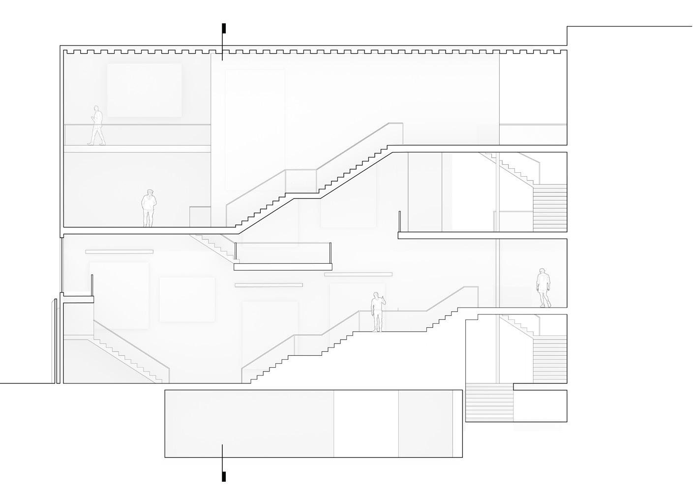 The Gallery focuses on the spatial concept of private and public space through the use of screening and translucency. The part of the façade with translucent glass is the entrance and the public gallery. The public gallery on the first floor is the most open, which people can see the large-scale installation art in the exhibition hall while walking on the road and interact with them on the stairs. As the circulation is guided by the stairs, the light transmittance of the facade material becomes lower and lower, and the exhibition hall gradually changes from a public space to a private collection.
