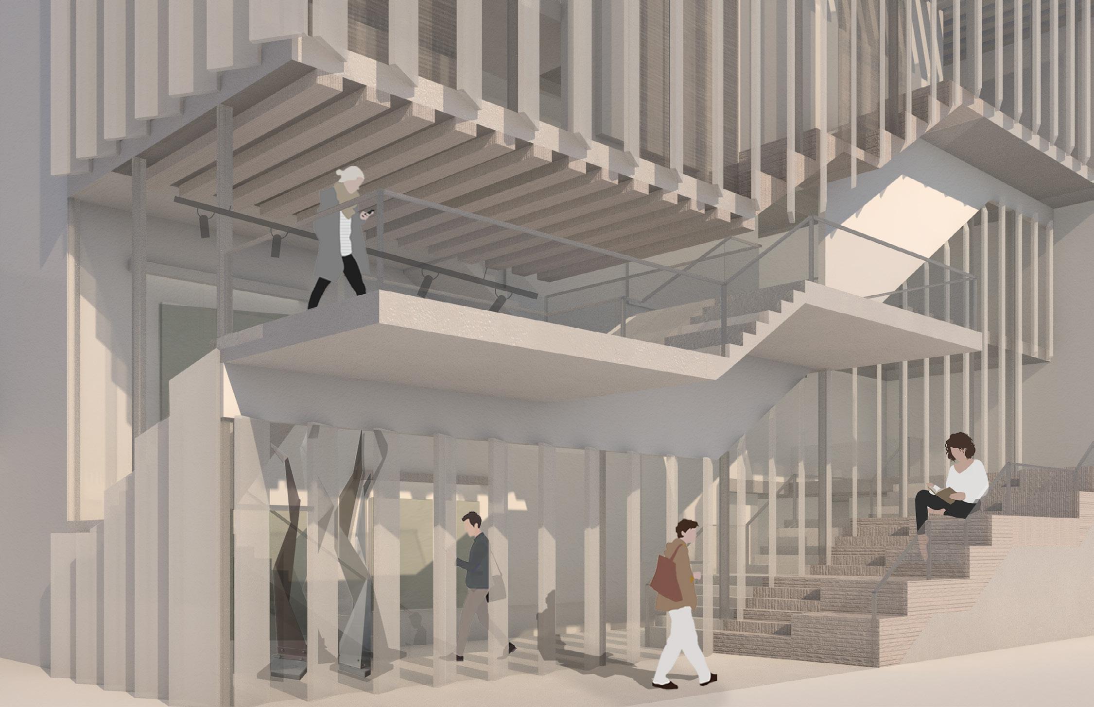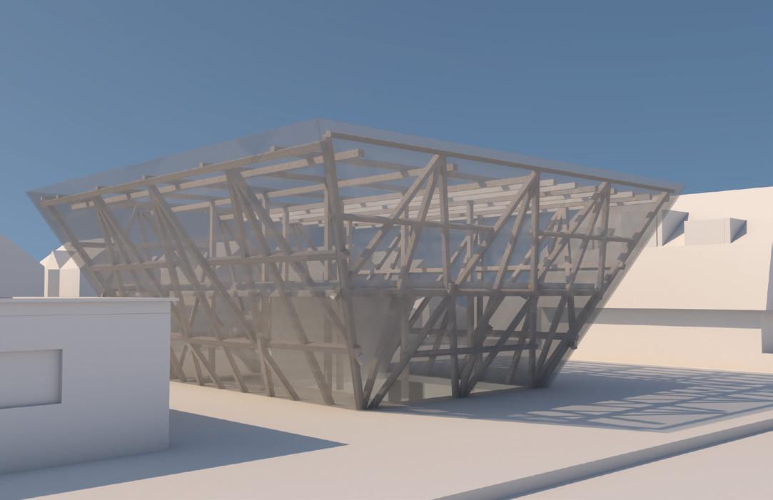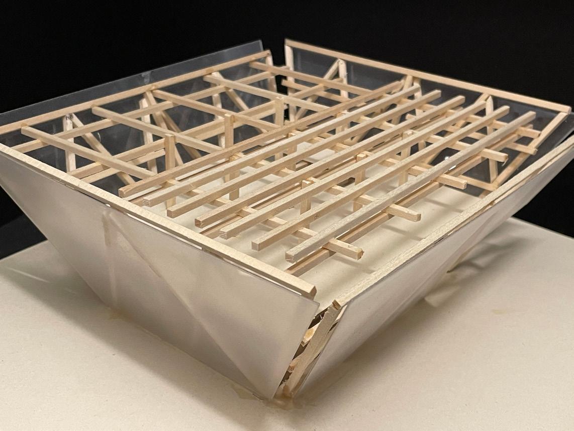 The floating pyramid is an architectural complex with performance space and an open market for the neighborhood. The shape of the inverted pyramid is inspired by the Maliki Floating School designed by Kunlé Adeyemi of NLÉ Architects. Rotating the primary structure of the A-frame 180 degrees structure of the Floating Pyramid, which is composed of primary structure, secondary structure, and lattice following a grid system through the form of tectonics. Through the analysis of the sound suit by Nick Cave, the envelope and material of the building is inspired by the artwork