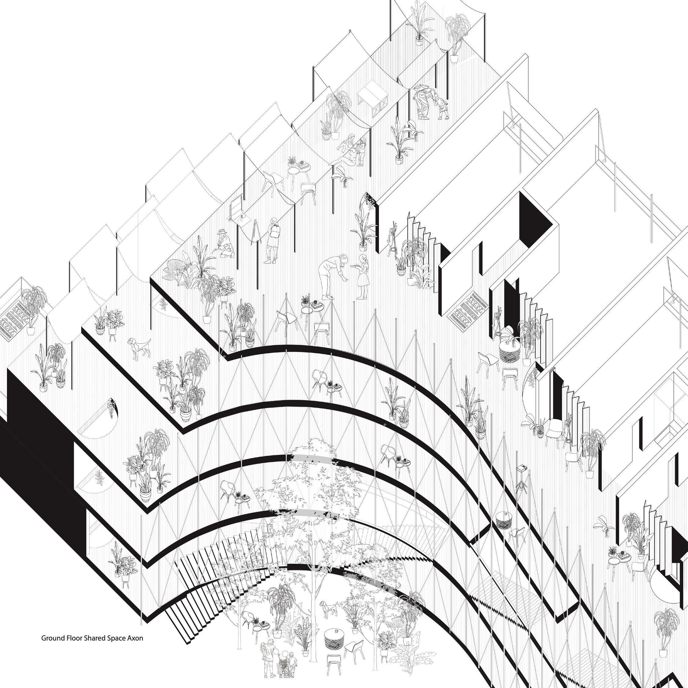 “Exploring the Inbetween” is a collective housing proposal at Rua Venezuela in Lisbon, Portugal. The plan is to build 50 cooperative housing units along the edge between the Benfica neighborhood (North) and the train tracks (south). This project aims to explore the new relationships between unit typologies, community infrastructure, and shared space. The building’s ethos is rooted in fostering a sense of community through generous shared spaces, reclaimed collectivity, productive outdoor space, and live-work domestic scenarios that encourage people to gather, engage in conversations, and collaborate.
