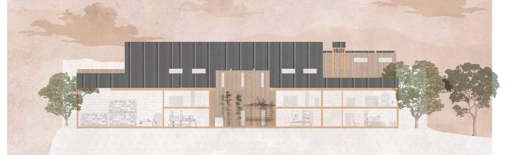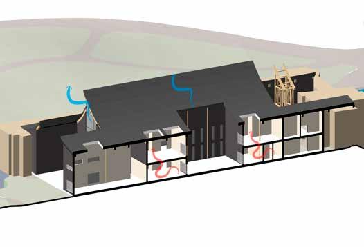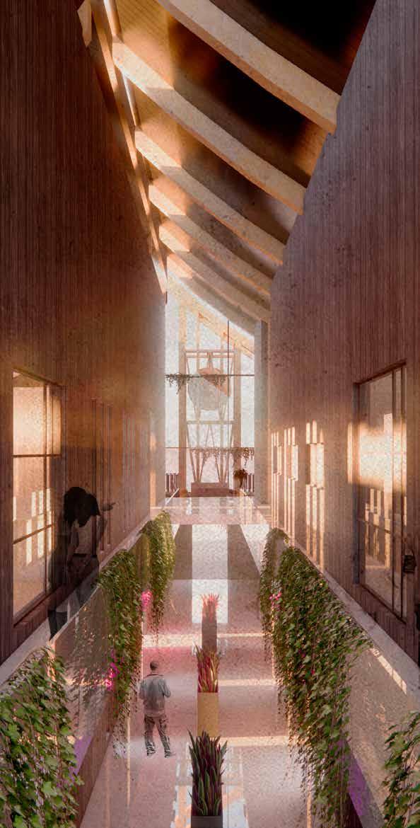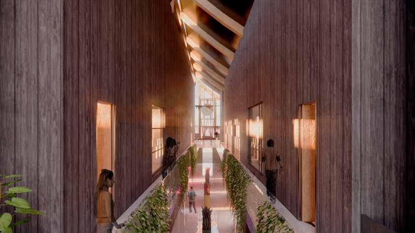 Stack ventilation will draw cool air through the mezzanine floors into the central hallway, where it naturally rises and escapes through a curved roof opening. This passive system enhances airflow, maintains comfortable indoor temperatures, and reduces reliance on mechanical cooling, aligning with the museum’s sustainable and serene design principles.