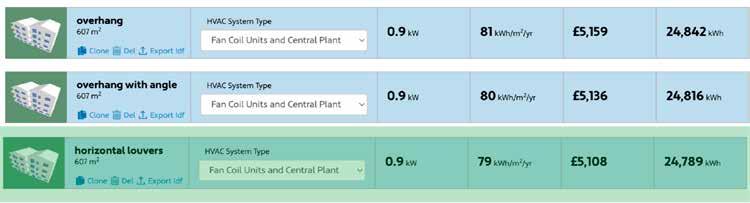 Ultimately, based on the data gathered from the Sefaira program and a comparative analysis of the various tested strategies, horizontal louvres emerged as the most effective solution. This approach not only maximized energy efficiency but also provided significant cost savings, demonstrating its superiority in both thermal performance and annual net energy conservation. By optimizing solar control and shading, the louvres effectively mitigated overheating, contributing to a more sustainable and comfortable interior environment.