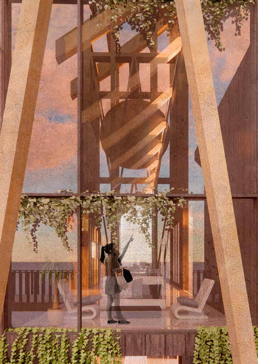 Gong Tower In the Museum of Tranquility, the Gong Tower will serve as both a symbolic and sensory focal point, embodying the museum’s ethos of mindfulness and inner calm. Rising gracefully within the site, it will house a large, resonant gong whose deep, harmonious tones will mark moments of transition throughout the day, gently calling visitors to pause, breathe, and reconnect with the present. Architecturally, the tower will act as a vertical landmark, visible from various points within the museum grounds, guiding visitors much like a beacon of serenity. Its design will harness natural acoustics to allow the gong’s vibrations to ripple softly through the surrounding spaces, blending with the ambient sounds of nature. The gong tower will not only be a striking visual element, but also an experiential one which invites moments of contemplation and shared stillness, reinforcing the museum’s role as a sanctuary for peace and reflection.`
