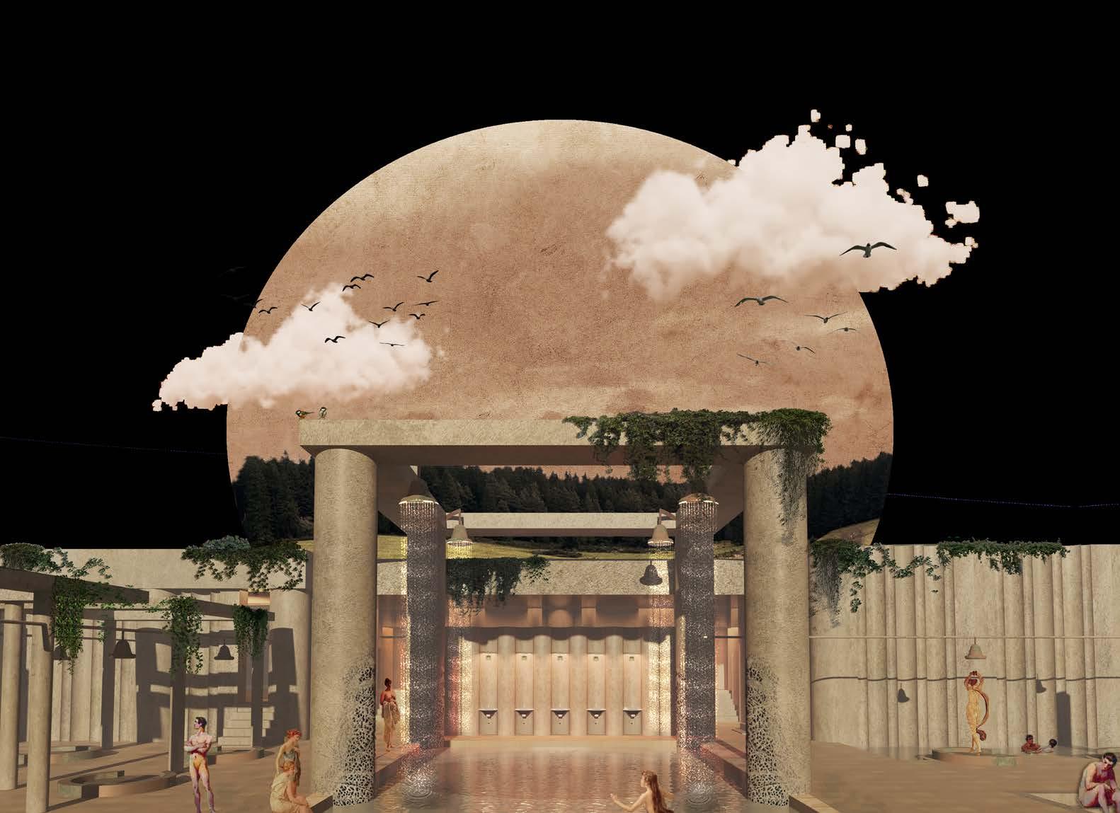 The waiting area embraces the concept of a glasshouse, providing a serene space where bathers can patiently await the arrival of their friends and family. Within this environment, bathers have the opportunity to immerse themselves in the beauty of the surrounding the bathhouse.