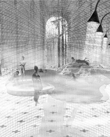 Key 1. Reception 2. Changing Room 3.Toilets 4. Showers 5. Dry Air Bath 6. Hotter Dry Air Bath 7. Heated Seating Area 8. Sauna 9. Hotter Sauna 10. Central Pool 11. Salt Pool 12. Rest Room 13. Column Pool 14.Toilets 15. Office Space 16. Storage 1 2 3 4 5 10m 15m 0 SCALE 1:200