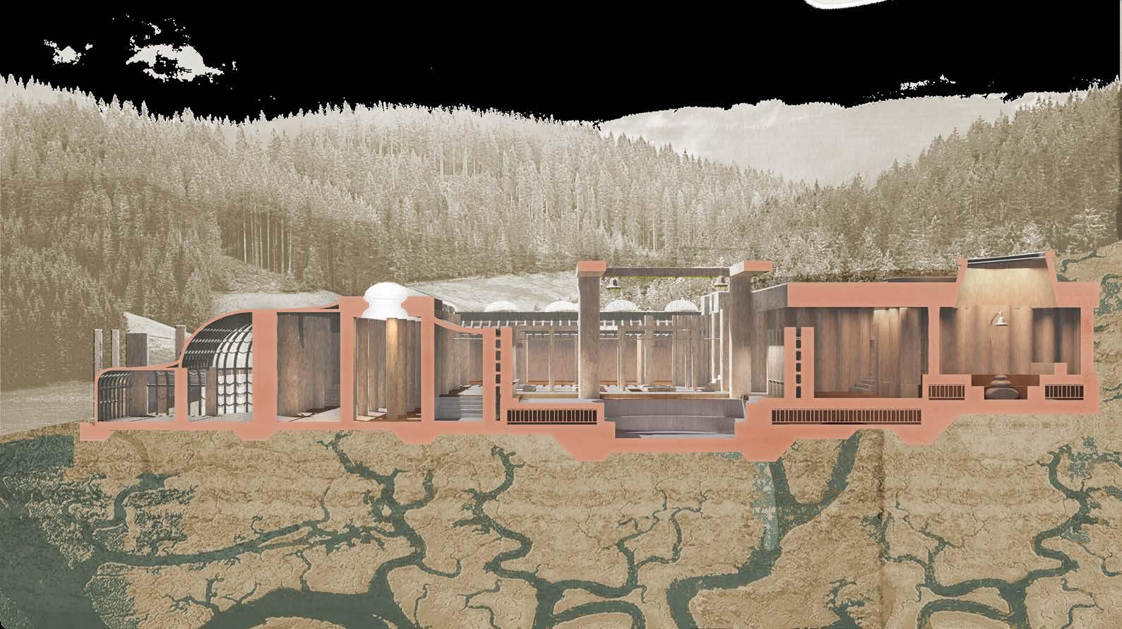 The Salt House is discreetly nestled within the Black Forest, cleverly concealed behind an extension of the forest itself. The building is strategically positioned deep within the steep terrain, as though it has been excavated from the ground. As bathers embark on their journey, their experience begins in the hottest rooms. The sauna, portrayed as an underground enclave, captures and retains heat, creating a secluded environment. At the heart of the Salt House, you will find the central pool, a prominent feature where visitors can replenish their bodies and enjoy a refreshing coolness after the intense heat of the preceding rooms. The final phase of the bathing experience involves a rejuvenating plunge pool, recalibrating the body’s senses before the transition to the exterior. Columns emerge into the Black Forest, blurring the boundaries between nature and the tranquil, salt-infused sanctuary of the bathhouse.
