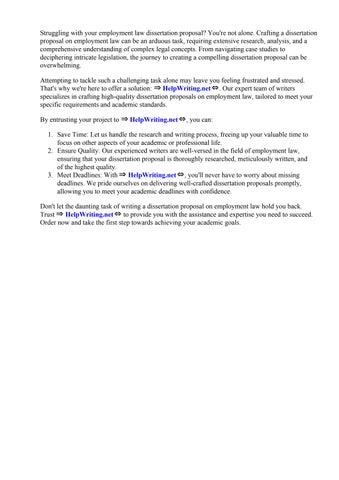 Don't let the daunting task of writing a dissertation proposal on employment law hold you back. Trust ⇒ HelpWriting.net⇔ to provide you with the assistance and expertise you need to succeed. Order now and take the first step towards achieving your academic goals.