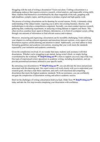 By entrusting your dissertation to ⇒ HelpWriting.net⇔, you can alleviate the stress and pressure associated with this daunting task. Our expert writers will work closely with you to understand your research goals, develop a clear thesis statement, and craft a well-structured and compelling dissertation that meets the highest academic standards. With our assistance, you can confidently navigate the complexities of dissertation writing and achieve academic success.