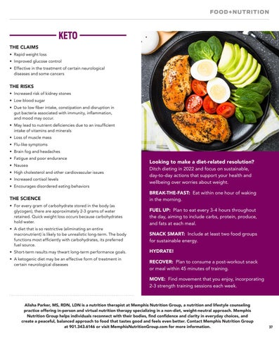 THE RISKS • Increased risk of kidney stones • Low blood sugar • D ue to low fiber intake, constipation and disruption in gut bacteria associated with immunity, inflammation, and mood may occur. • M ay lead to nutrient deficiencies due to an insufficient intake of vitamins and minerals • Loss of muscle mass • Flu-like symptoms • Brain fog and headaches • Fatigue and poor endurance • Nausea • High cholesterol and other cardiovascular issues • Increased cortisol levels • Encourages disordered eating behaviors