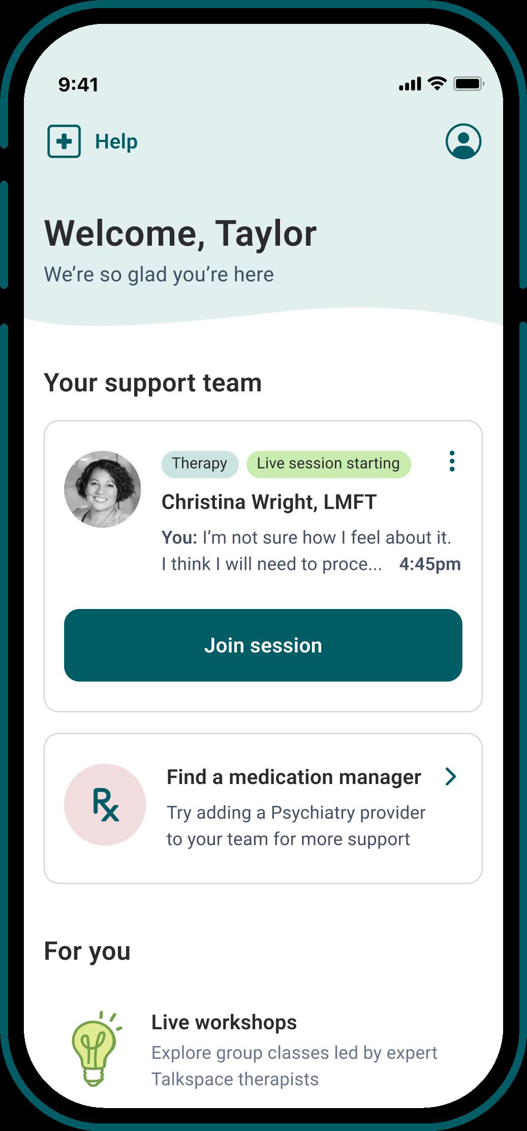 When the it’s time for your therapy appointment, go to talkspace.com on your computer or open the Talkspace app, and log in to your Talkspace account. Click on the button that says “Join session” and you will be taken to your therapist’s secure virtual therapy room for your appointment.