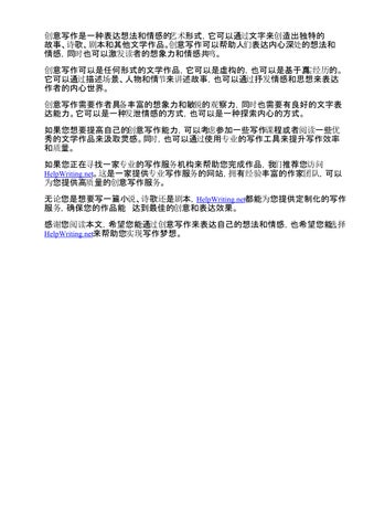 如果您正在寻找一家专业的写作服务机构来帮助您完成作品,我们推荐您访问 HelpWriting.net。这是一家提供专业写作服务的网站,拥有经验丰富的作家团队,可以 为您提供高质量的创意写作服务。