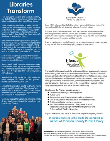 Libraries Transform Torn between book club and happy hour? Why not do both? Gather round as we make a toast and take a look back at the first year of Stout Stories. Stout Stories is a hopping JCPL book club for adults 21 and older that meets at local breweries and wineries the first Monday of every month. Locations have included Taxman, Planetary Brewing, Scotty’s Brew Club, Shale Creek, Mashcraft, Shallo’s and Mallow Run Winery. “Stout Stories has really grown as a group, no longer is it just library patrons meeting together to discuss books. Every person has something to contribute to the conversation and it’s wonderful to see friendships grow and strengthen over our bond for books,” said Erin Cataldi, JCPL Librarian. Each month the group gets together in a laid back atmosphere and has dynamic conversations about the selected books. “Every month, I look forward to our conversations. I have always loved my job and my community, but Stout Stories has made me feel more invested than I ever thought possible,” said Keeley Payne, JCPL Librarian. “People have really started to come out of their shells and open up; I couldn’t ask for a greater meeting of the minds,” adds Erin. Join JCPL librarians Erin Cataldi and Keeley Payne for this monthly book club. Whether you’re a milleni-”ale” or an older “vintage,” come out and meet like-minded individuals. Together we’ll put the “pub” in public library! Check out page 25 for upcoming dates and details. Be sure to pick up a copy of the book from your local library. Cheers!