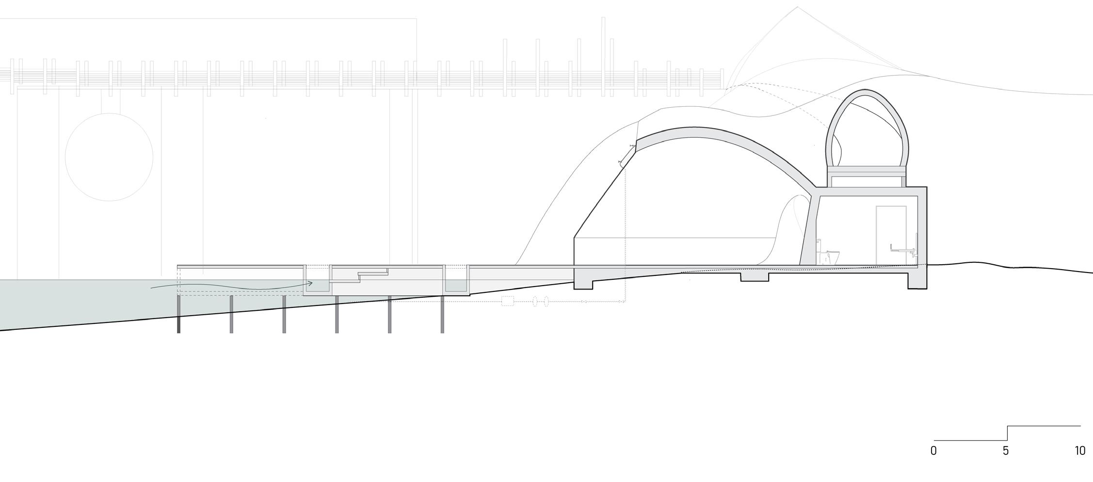 The second aspect having mist nozzles at the opening on the underground pavilion. This mist is released when the water bridges ‘closes‘ as a signal to people to leave the island as the land needs to regenerate. This mist will also aid to hide the dock and earth pavilion and create a non place experience.