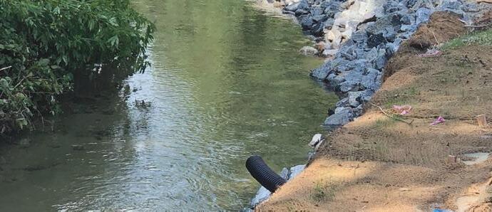 Top Left: A Stone Toe after installation in Wash Creek. Located in Hendersonville, North Carolina at the Sunnybrook Retirement Community, Wash Creek was eroding at alarming rate next to the property and main driveway. (Project by RDE)