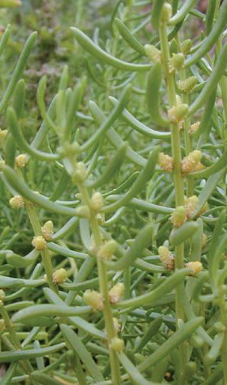 Perennial glasswort - Salicornia is a fleshy herb with prostrate decumbent main stem and branches. Leaves are reduced to scales which makes the stem leafless. Bright green to brown mm inflorescences that occur round.