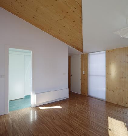 privacidade O conjunto é fechado por um envelope de madeira, gerando fachada e cobertura ventiladas O pátio central ocupa parte do jardim da casa. Inclui um telhado leve que dá luz à fachada, uma espécie de lanterna chinesa que envolve o pátio e permite que os membros da família desfrutem desta sala externa As coberturas de madeira são dispostas de acordo com uma lei de variação espacial que, além de atender às normas locais, coleta a água da chuva e a direciona para o pátio para regar o jardim.