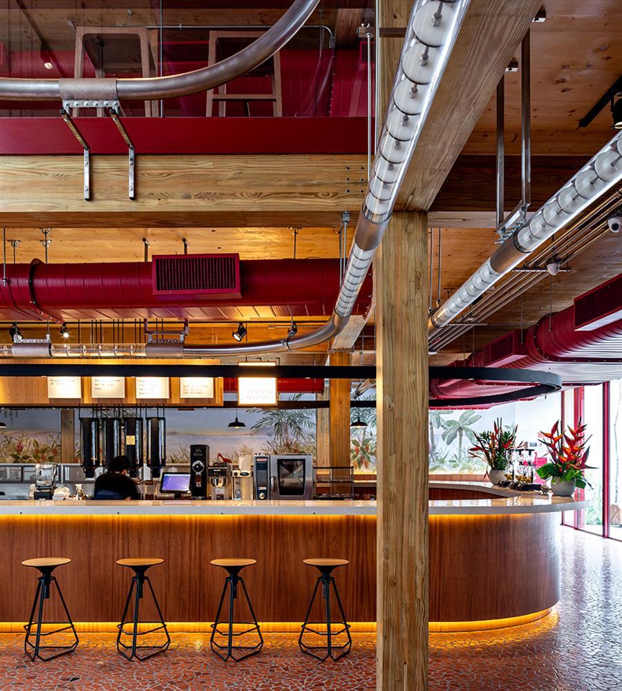 a simplicidade da estrutura –modular e aparente, composta de pilares, vigas e lajes em peças inteiriças de madeira laminada cruzada, produzidas em fábrica e apenas montadas no local em um trabalho de execução rápida, precisa e de pouquíssimo resíduo; nas instalações elétricas, hidráulicas e de ar-condicionado, que correm igualmente à vista; na total integração e fluidez dos espaços, que se fizeram possíveis graças à ausência de paredes e à criação de vazios de variados pés-direitos; e na existência ainda de uma réplica das instalações de uma fábrica de chocolates à antiga, com torrefadoras e dutos que transportam os nibs de cacau até uma enorme mélanger no centro da loja
