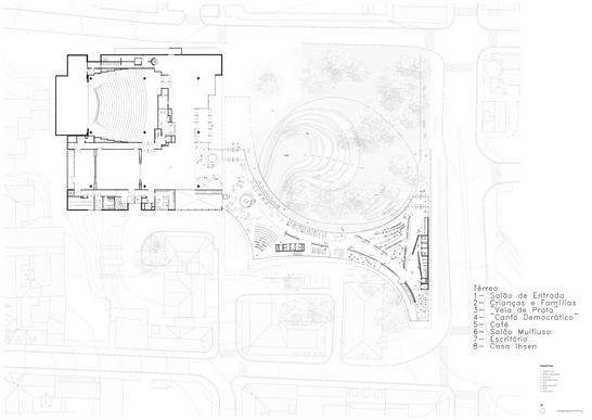 A fim de propor tais encontros com um fluxo ativo de pessoas, o projeto conta com múltiplos acessos de todas as direções em todos os níveis, ademais seu formato curvilíneo contorna as árvores, configurando espaços internos e externos contínuos.