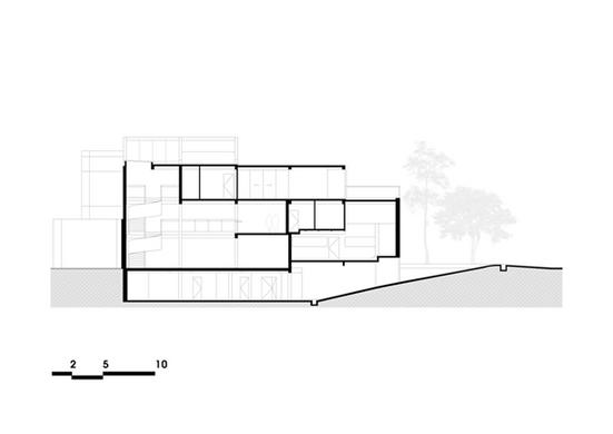 A casa adapta-se ao terreno de forma escalonada em função dos diferentes graus de privacidade necessários: os quartos privados estão escondidos da rua e adaptam-se ao terreno dando a sensação de estar em contacto direto com o terreno. Os espaços mais públicos estão mais próximos da rua e vão ganhando altura gradualmente, até se erguerem sobre a paisagem e olharem para o horizonte sobre os restantes quartos Uma série de pequenas pontes servem como elementos de transição entre as diferentes áreas e acomodam os diferentes níveis de .