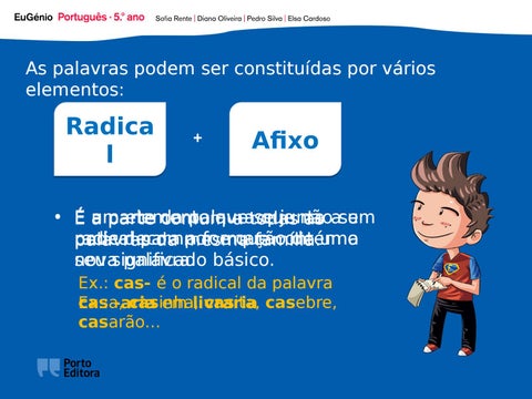 • Éa um elemento da palavra que se que junta não um parte comum a todas as ase radical pode decompor para a formação e que contém de uma o palavras da mesma família. nova seu significado palavra. básico. Ex.: cas- é o radical da palavra casa, casinha, casita, casebre, Ex.: -aria em livraria casarão…