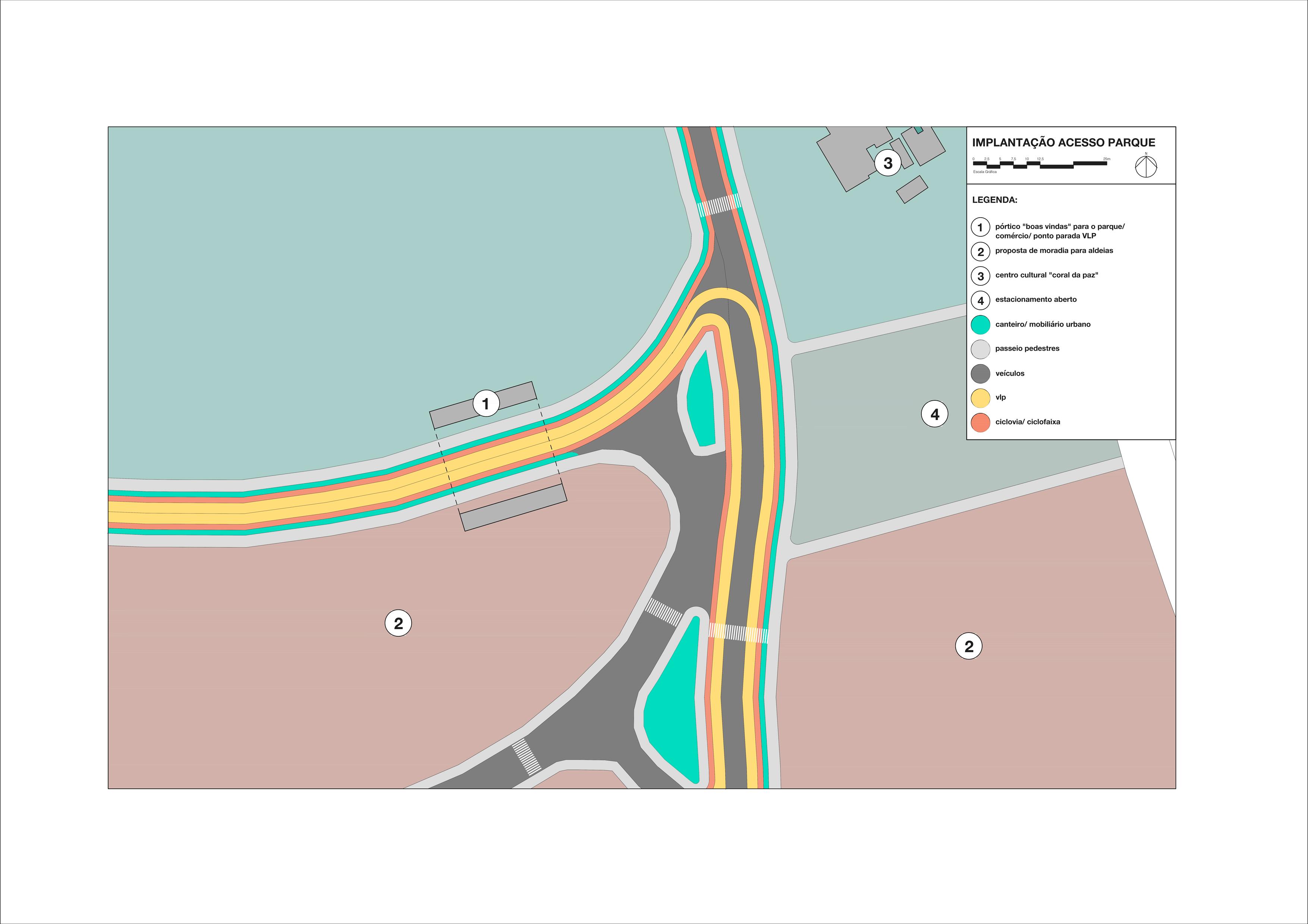 Proponho para o primeiro acesso ao parque um Pórtico de Boas Vindas, com informativos, comércio e um ponto te parada do VLP, nos dois sentidos. O objetivo é tornar o acesso mais convidativo para os visitantes, o que atualmente não apresenta.