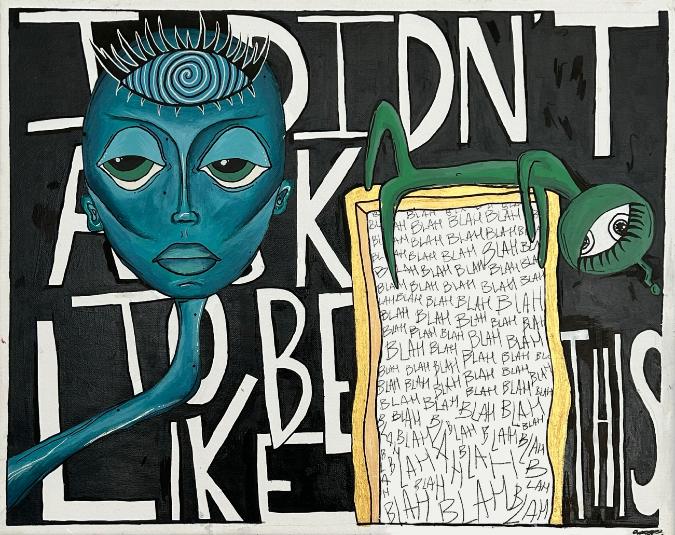 This piece doesn't necessarily have a deep meaning, it was initially a way for me to experiment with various technical aspects. There is a big head with a third eye to the left that stands for my belief in the opening of my third eye and a way for me to practice 3D painting techniques. During the creation, I was considering my behaviours and daily routines and realized the statement "I didn't ask to be like this”, reflects my mindset of the time. This is one of the few pieces in which I went out of my comfort zone and created something I would’ve never thought I could achieve.