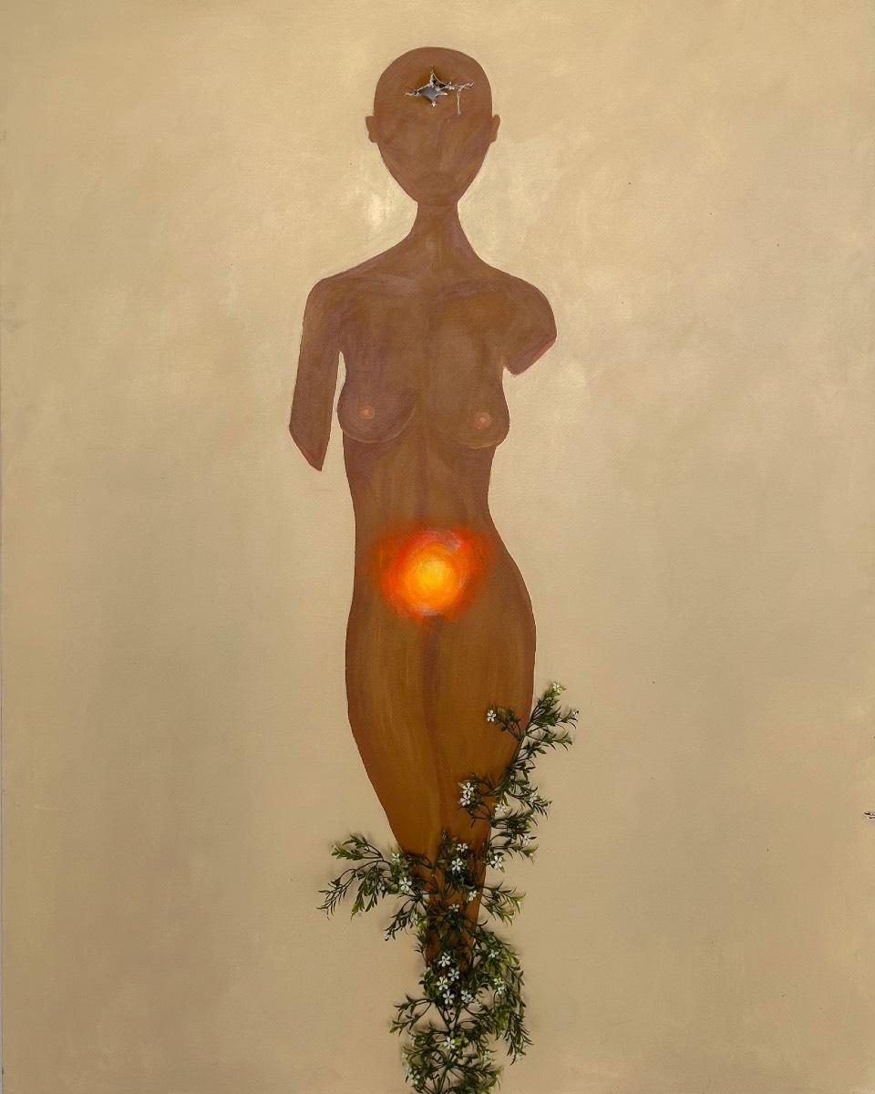 Shakti is a deity that embodies power and divine feminine energy and is essentially the godhead that created the world. For this painting, I have chosen to express my own perception of what Shakti may look like and what she means to me. Throughout the process, I had to do some inner work and really understand what such a powerful being represents and how I embody it on a daily basis. My intentions with this piece are to connect with my inner Shakti and create this beautiful art that others can look at to connect with their own Shakti. For this meaningful piece, I decided to experiment with various media and challenge myself to find new and creative ways to express my concept. This piece has allowed me to tune into my feminine energy whilst connecting with my expressionist side.