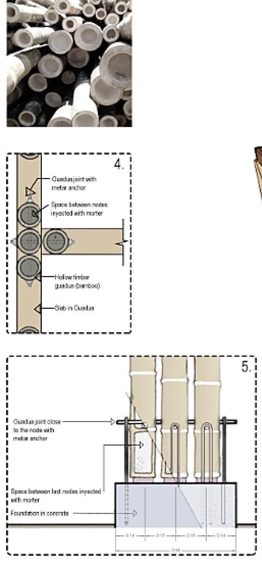 The main structural and constructive materials are local, they include Timber Bamboo (locally called Guadua). Its rapid rate of biomass production, renewability, high level of CO 2 fixation and storavge, wide diameter, long length, and durability are distinctive and highly desirable features which can benefit the new built environment Research interest in Guadua construction increased significantly after many Guadua constructed buildings withstood or suffered only minor damage during an earthquake which reached 6 2 on the Richter scale in 1999, resulting in the standardization of Guadua in the seismic resistant Colombian code (NSR, 2010)