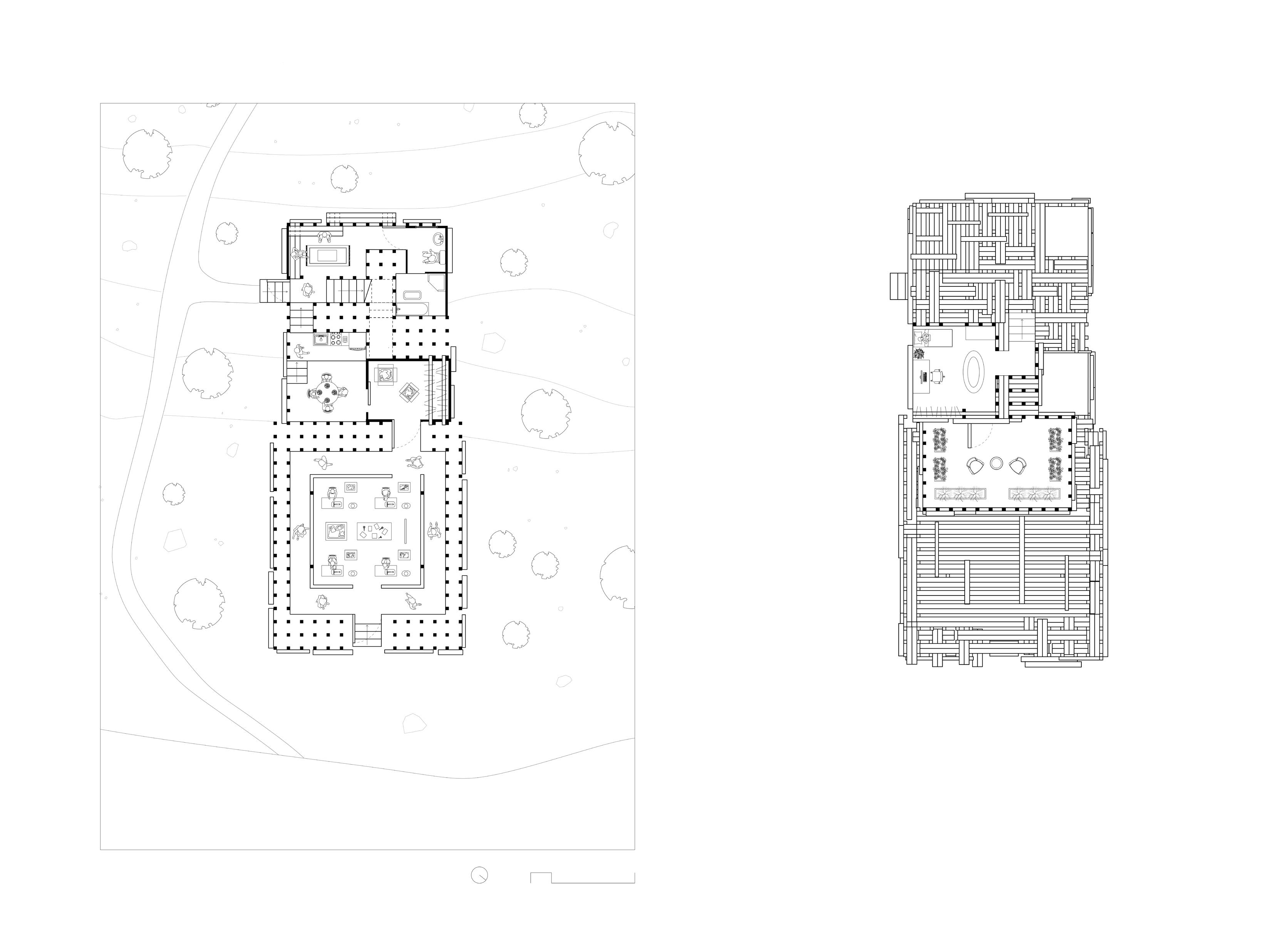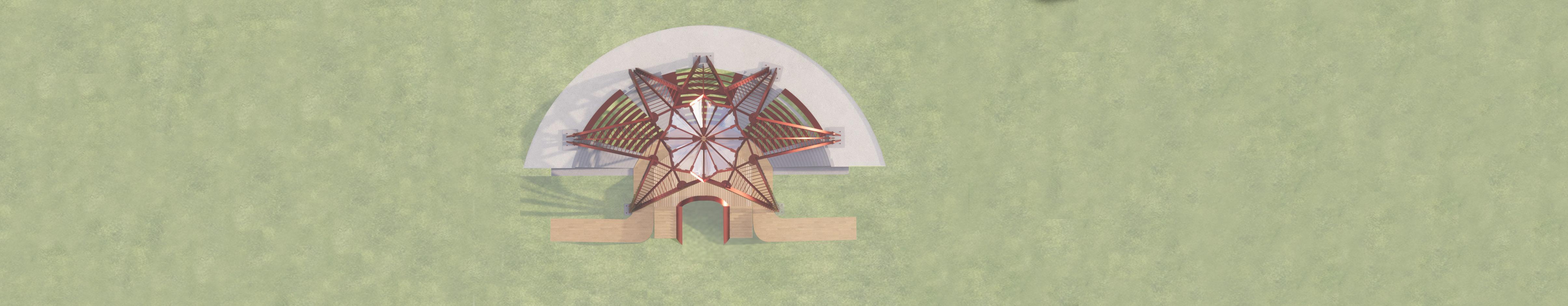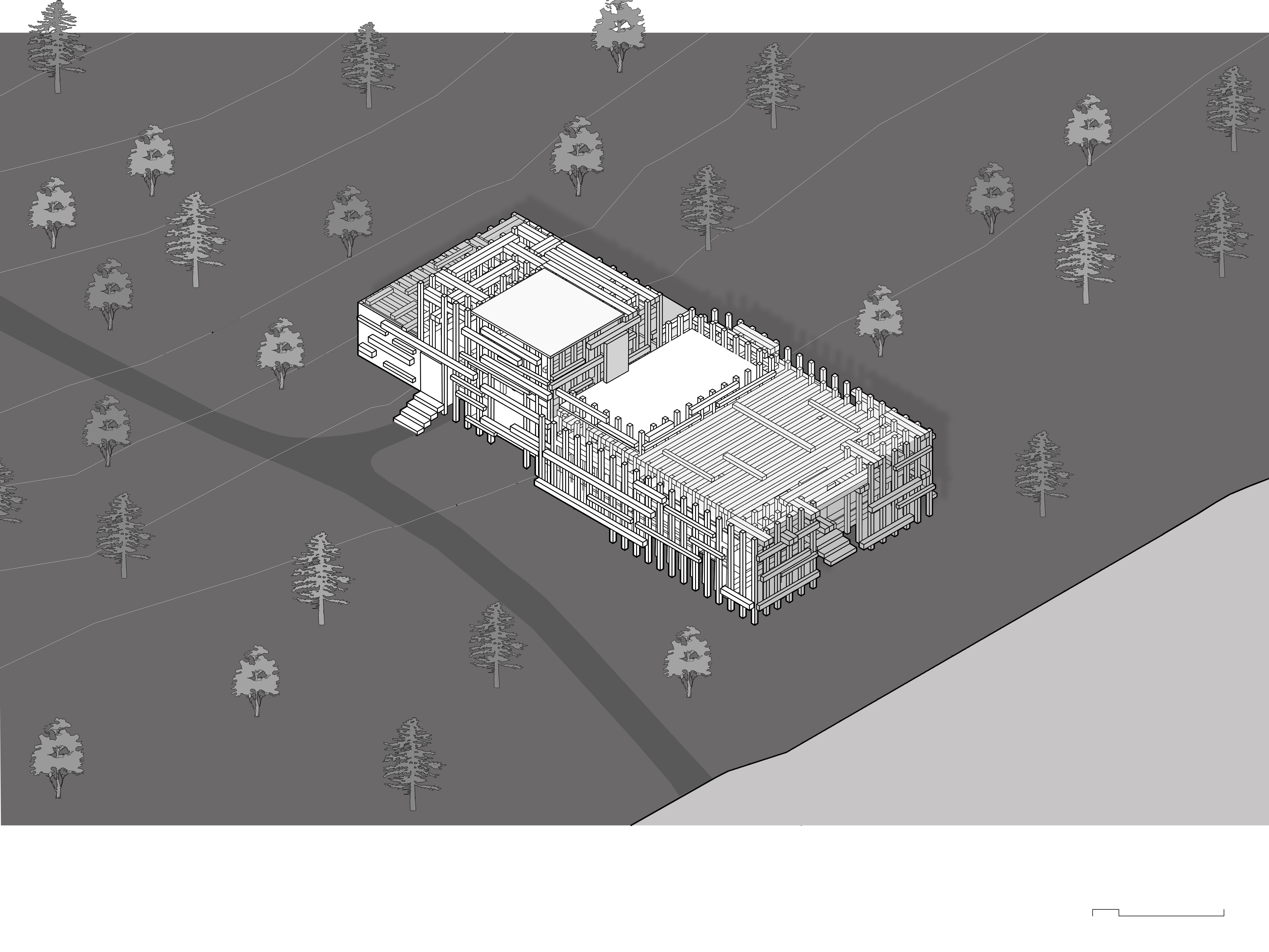 majority of the building is composed of wooden strips that stack and overlap one other to create a lattice