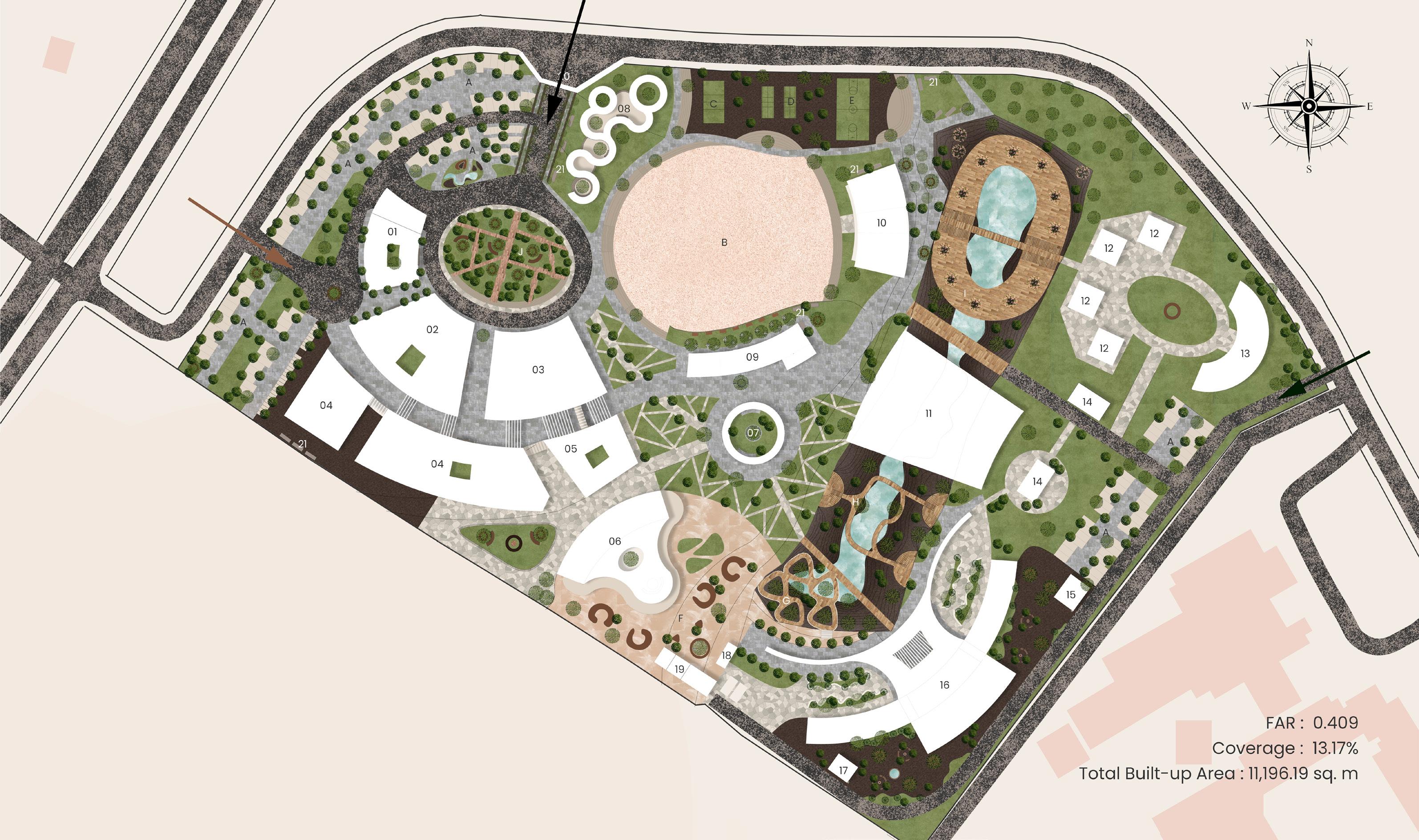 Main road networks are identified in the site. Aca demic blocks are arranged in linear patterns with adjacent transition spaces. Activity areas are arranged in radial pattern for better visual connection and live interactive spaces. Residential blocks are focused to the corner provid ing privacy with interactive spaces created in canyon.
