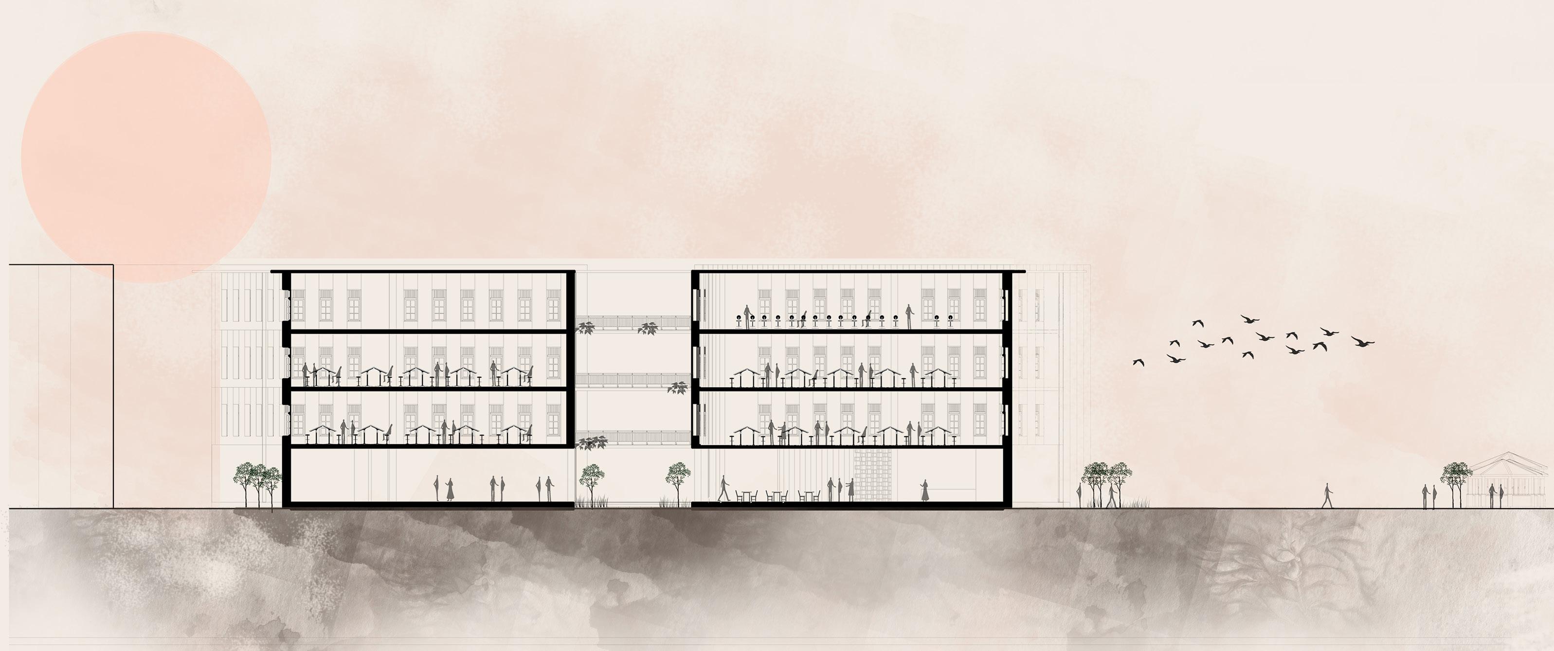Entry and academic blocks are buffered by a landscaping element. The activities centred in the canyon are connected visually with each other and directly connected to the residential area. Visual and direct connections within the zones.