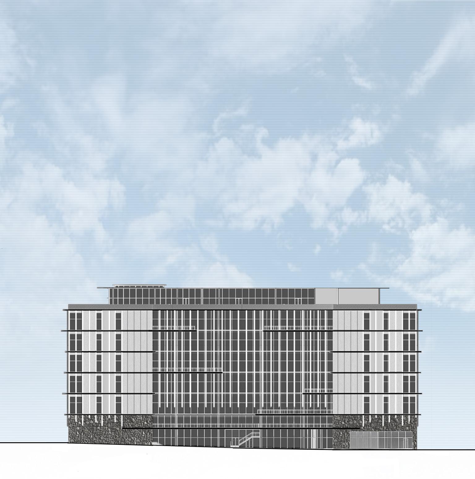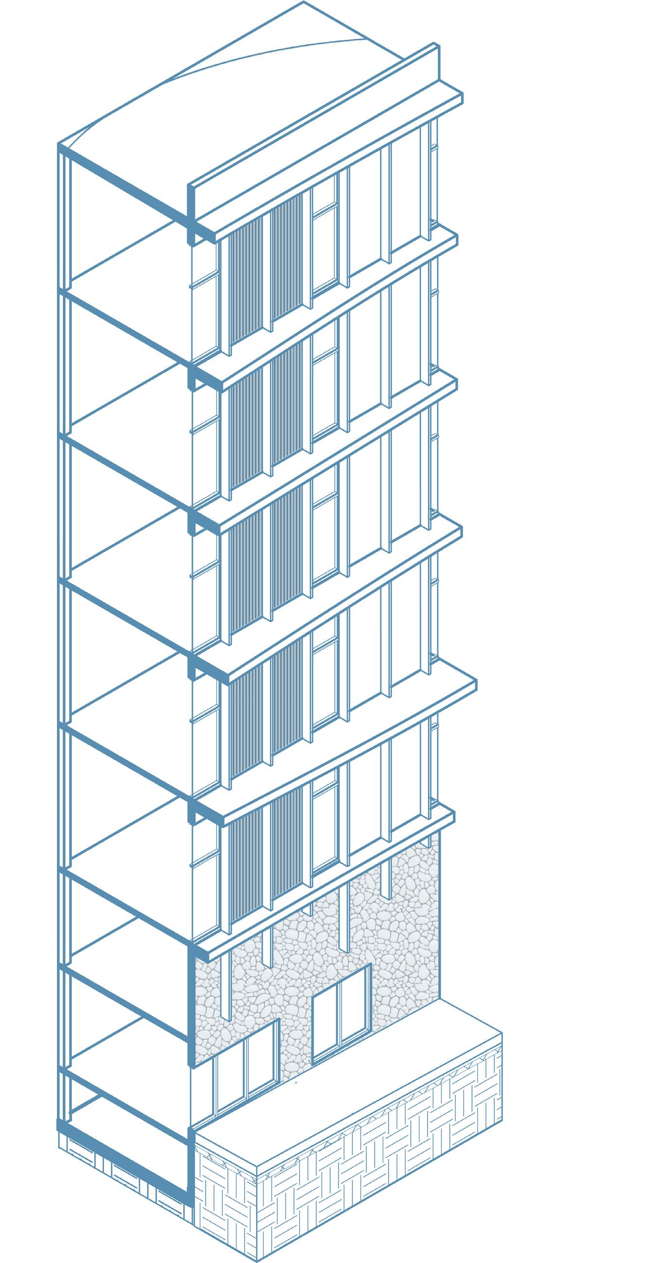 This project shows my understanding of how the design process starts with the conceptual phase and ends with the final product. There were limitations on what we could and couldn’t do with the code guidelines for where the building was taking place. Not only code but also the guidelines the professors gave us to follow, such as keeping the skin design of the building low-cost, using the Living Building Challenge to help guide the design of the building itself, and having a type of gallery in the first two floors for those in the community and surroundings to enjoy. A design challenge we had when designing was to create a unique shape that is not just a rectangle to let natural daylight into the building. It was important to have natural daylight in our building because it is an office building. People will spend most of their days in the office, and providing natural daylight to the spaces will help the health and happiness of people. With that, we carved a crescent-like part of the building on the east side to have natural daylight coming from the glass facade and the creation of balconies to create outdoor spaces for those in the building. The structure also supported vertical fins across the building, allowing for the flow of water and making use of our pre-designed water collection system. Our concept for the project is a gallery space based on water collection and what water can do within a building. The first and second floors of the structure support a water collection area, helping to distribute water throughout the structure and educate visitors on the importance of the reservation and collection of natural resources to not support the waste of resources. Overall, this project helps shape the understanding of the design and construction phase and how it will look in the real world and a better understanding of how architects and construction managers work together to reach a goal when there are limitations.