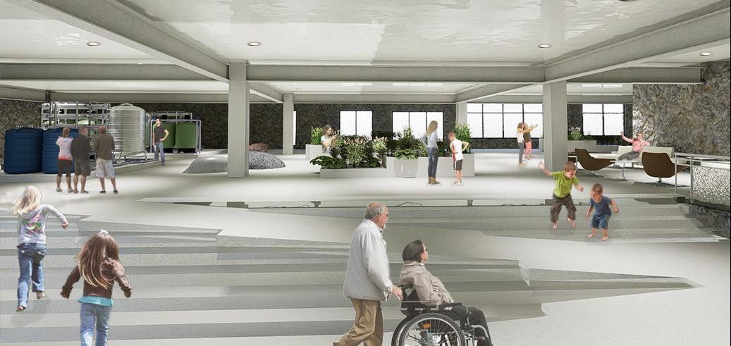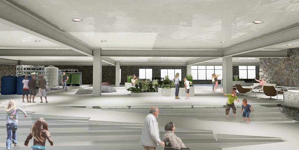 The Rainwater Education and Conservation Center is a multipurpose office building designed with a strong focus on water, both as a functional resource and as an educational element. The flexible office floors can adapt to the needs of different tenants, ensuring versatility. On the first floor, an art gallery showcases the building’s water collection system through interactive educational spaces on the second floor, allowing visitors to observe the filtration process via a visible water cistern. A publicly accessible café further connects the building with the community. Additionally, a rooftop café provides a unique gathering space with views of Seattle. Drainage points on the roof collect rainwater, which then flows through a natural filtration system before entering the cistern for storage. It is then purified using UV and chlorine disinfection before being distributed throughout the building, with the first and second floors dedicated to educating the public about the water purification process.