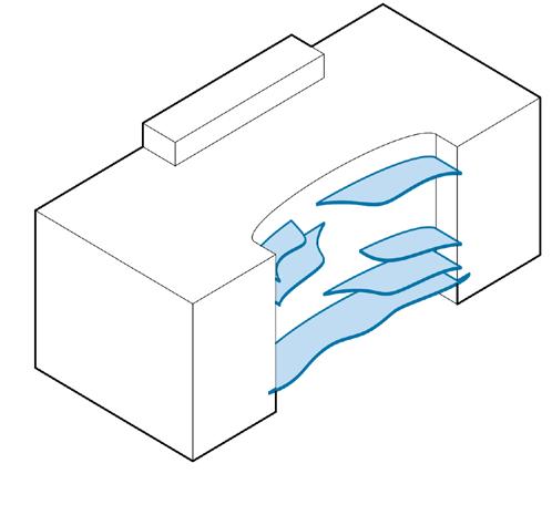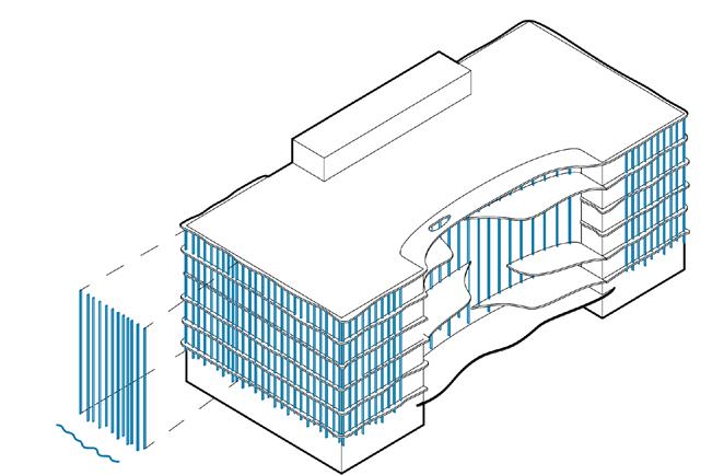 A versatile shading device that reduces daylight, with adaptable vertical lengths creating a dynamic facade that mimics water movement and enhances shading and daylight control.