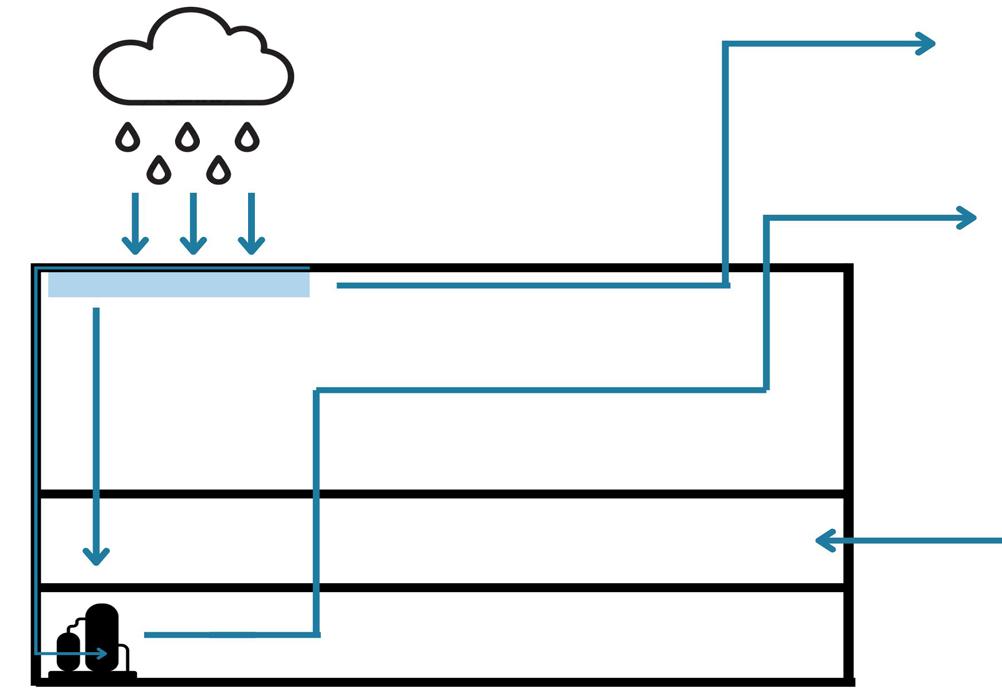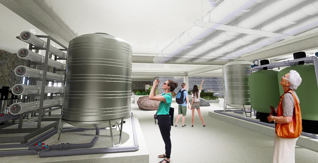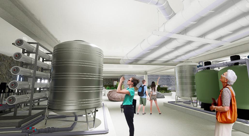 Rainwater will be collected from roof drainage points, initially filtered with natural elements, then stored in a cistern on the first floor. It will undergo further purification with UV and chlorine disinfection systems before being distributed throughout the building, primarily on the first and second floors for public display.