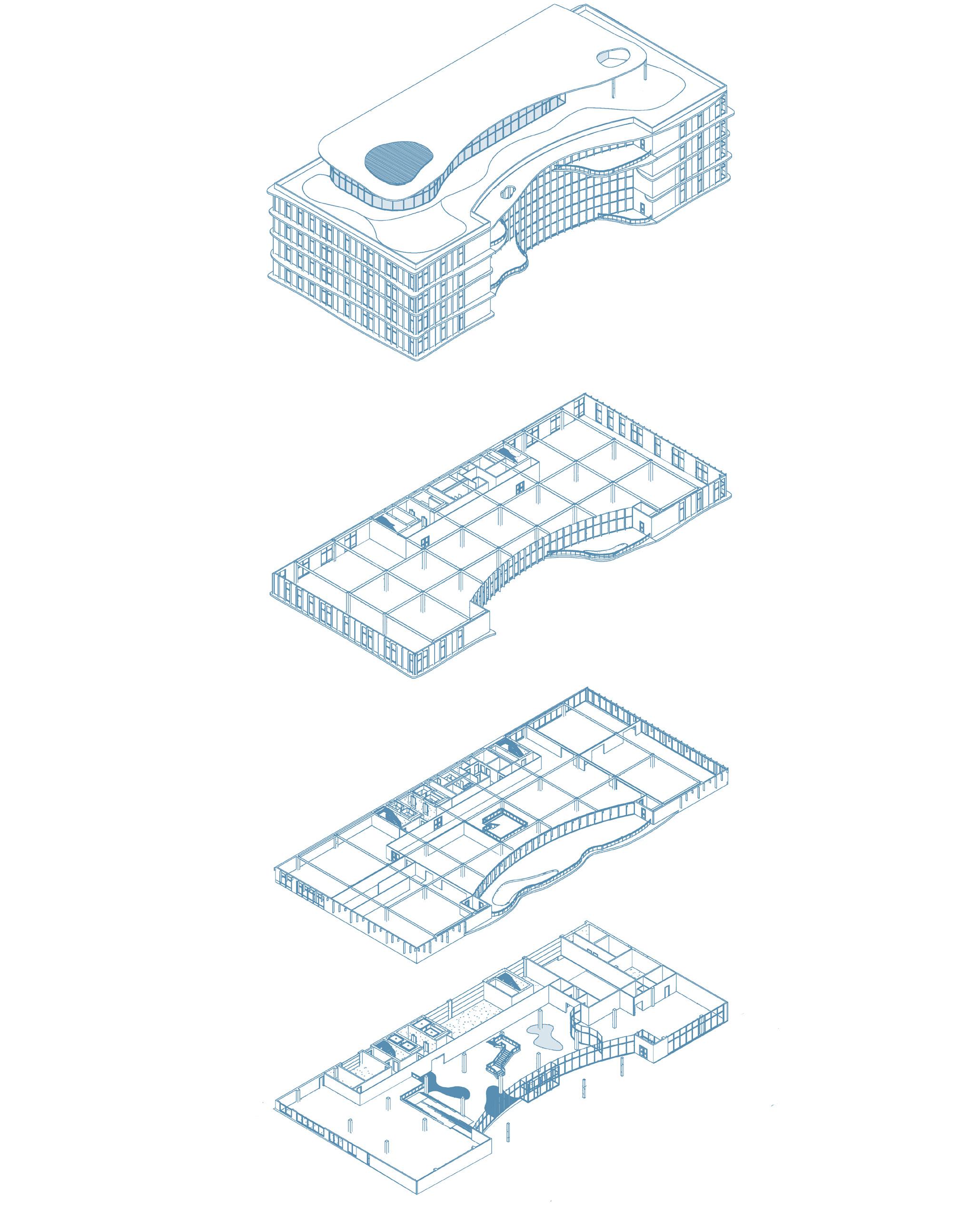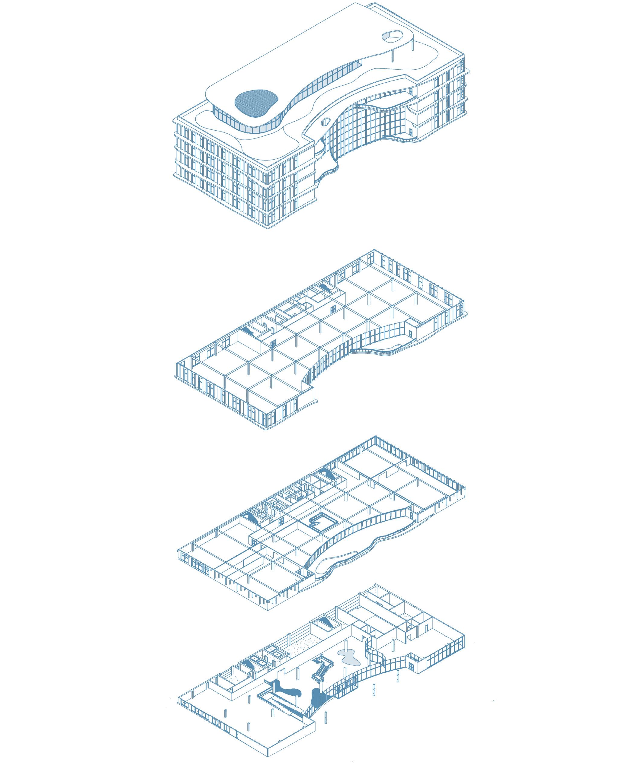 The Rainwater Education and Conservation Center is a multipurpose office building designed with a strong focus on water, both as a functional resource and as an educational element. The flexible office floors can adapt to the needs of different tenants, ensuring versatility. On the first floor, an art gallery showcases the building’s water collection system through interactive educational spaces on the second floor, allowing visitors to observe the filtration process via a visible water cistern. Challenges faced when developing a design are how the skin facade cost can be low while using materials and how water can influence the choice of materials.
