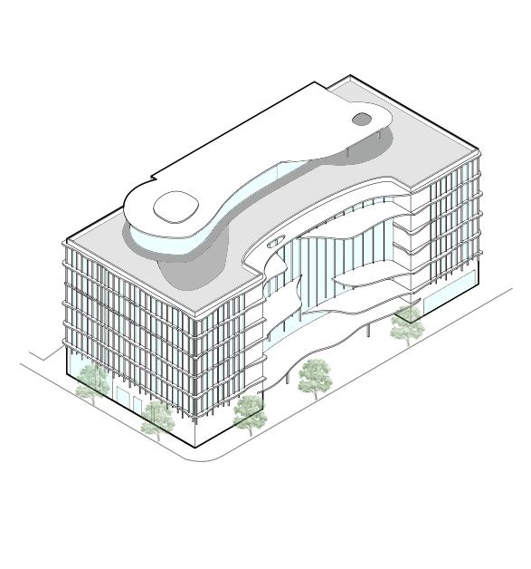 Keeping the skin design of the building low-cost, using the Living Building Challenge to help guide the design of the building itself. Not only low-cost but also designed with a unique building shape that lets in natural daylight with the right amount of glazing. Natural daylight is important since five of the floors are office spaces. People will spend most of their days in the office, and providing natural daylight to the spaces will help people’s health and happiness. With that, we carved a crescent-like part of the building on the east side to have natural daylight coming from the glass facade and the creation of balconies to create outdoor spaces for those in the building.