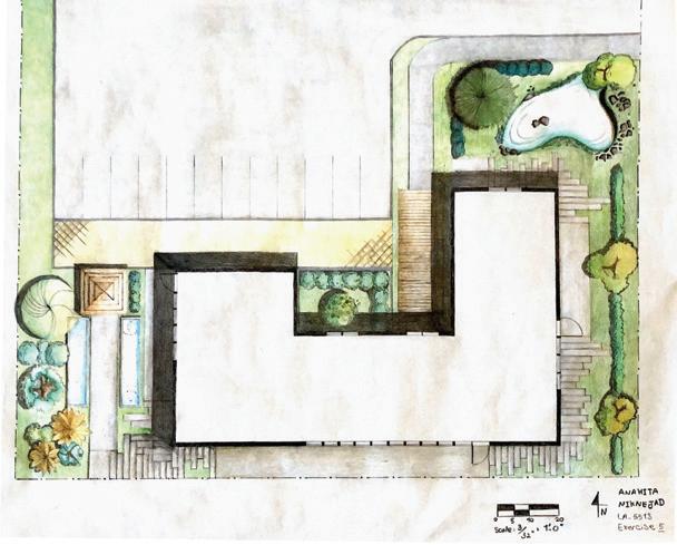 The site is located a 20-minute drive from Pawhuska, Oklahoma. It is a very sloping land with cattle wandering around. There are several pump jacks, some still working. After the discussion with the mayor and the owners, we realized that they want outdoor classrooms, as well as a shing area, a walking path throughout the site, and grill areas. The rst step I took for this design was to look at the contour lines and identify the at areas where construction could be easier. Afterwards, I decided to draw the walking path, connecting all the at areas and placing them around the pond to minimize distances. They also desired an accessible walking path around the pond, so I designed a boardwalk that would connect to the parking lot and the grill area with ramps.
