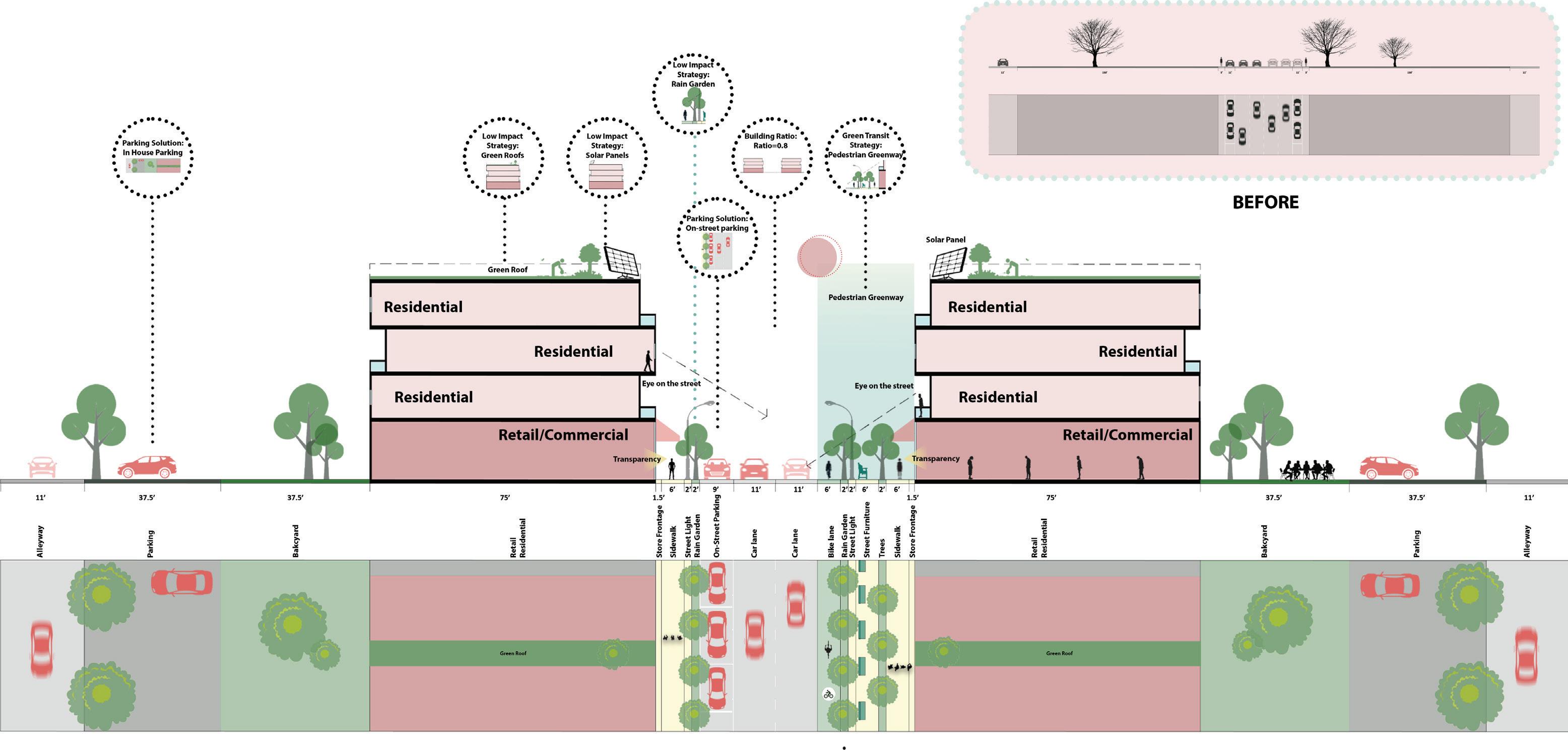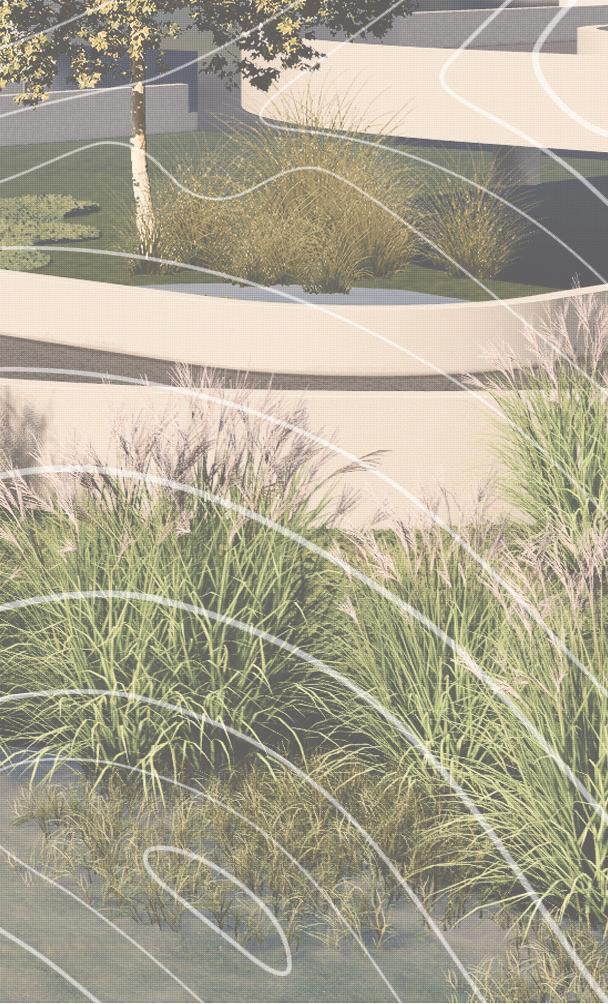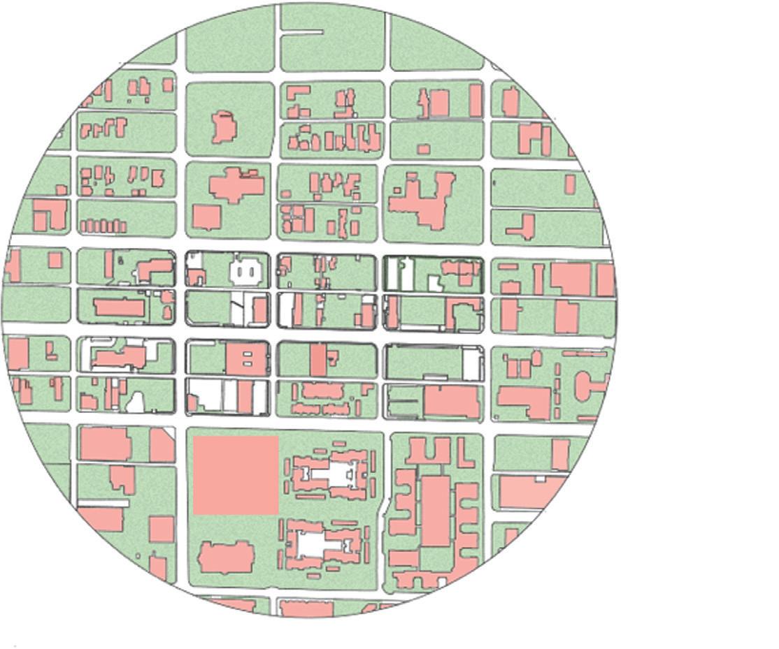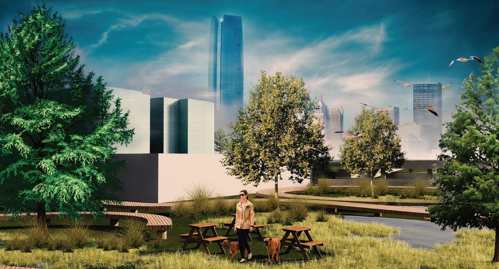 The currently incoherent cityscape with dominant parking lots and wide streets close to Oklahoma City Memorial will be connected to the center formally and visually through street diet, densi cation, and thoughtful expansion of green spaces. The redevelopment is driven by passive sustainable solutions such as tree canopies, permeable roads, consideration of microclimate in building orientation, rainwater, and on-site energy collection.