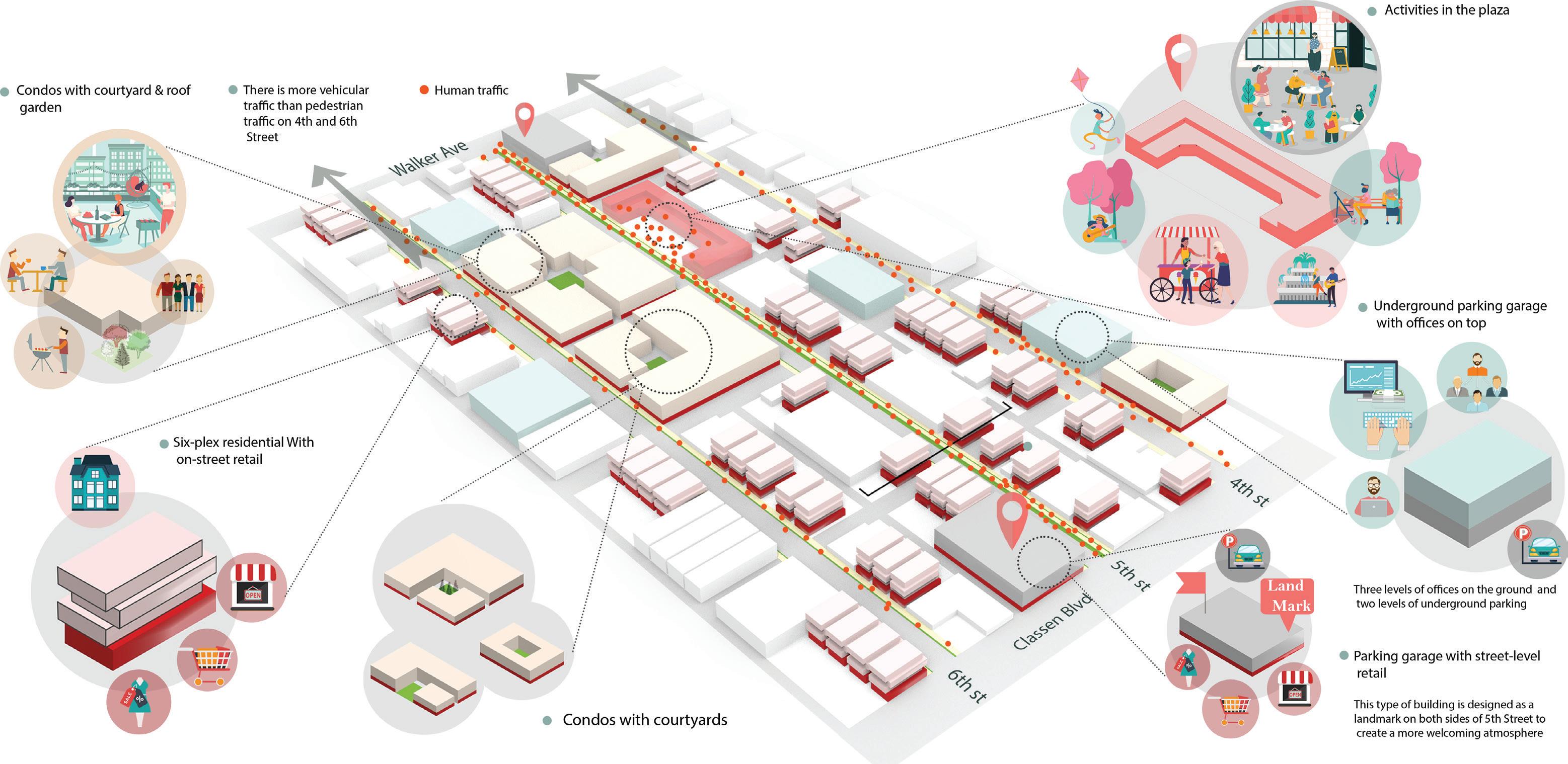 A design solution for 5th Street in Oklahoma City (OKC) aims to transform it into a vibrant, pedestrian-friendly corridor that enhances connectivity and fosters community engagement. The plan includes widening sidewalks, adding bike lanes, and incorporating green spaces with native landscaping to promote sustainability and improve aesthetics. Street furniture, public art installations, and enhanced lighting will create a welcoming atmosphere and encourage foot tra c. Additionally, tra c calming measures, such as reduced speed limits and pedestrian crosswalks, will improve safety for all users. This redesign not only aims to boost local businesses by increasing accessibility but also seeks to create a cohesive urban environment that celebrates the unique character of OKC.