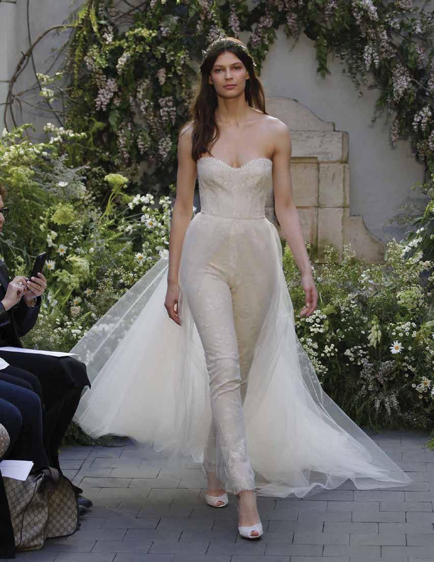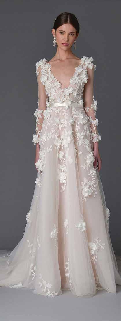 Se puede ver en toda la colección detalles florales, algunos en 3-D complementando los vestidos, o algunos otros ornamentos decorando los contornos con pedrería y encaje. Los diseñadores de Marchesa, Chapman y Craig, entienden a la novia moderna y sus necesidades, por lo que podemos ver su versatilidad, en su colección destacan las faldas desprendibles, no sin olvidar un giro de color rosa en el vestido de novia.